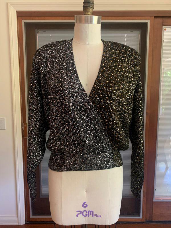 80s Label St, John Half silver half gold! Wrap front, blouson style, wide shoulder pads, ribbed waist. Iconic 80s style.
