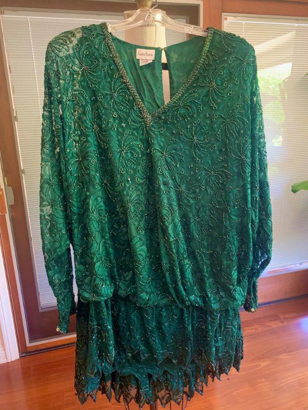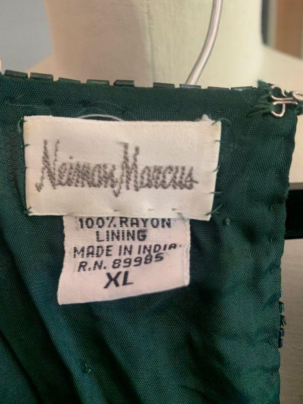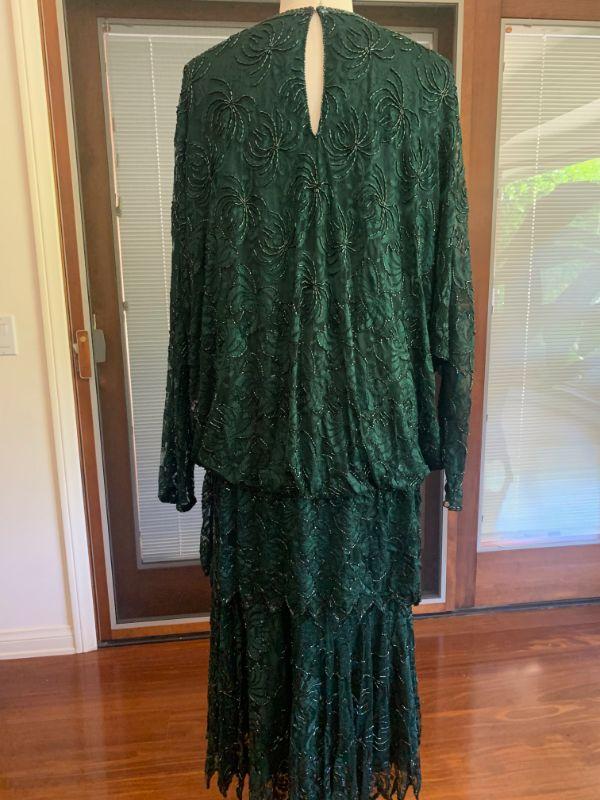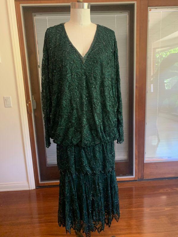 Vintage Neiman Marcus 2 pc. rayon, fully beaded long sleeve top and full skirt. Dark green. Size XL