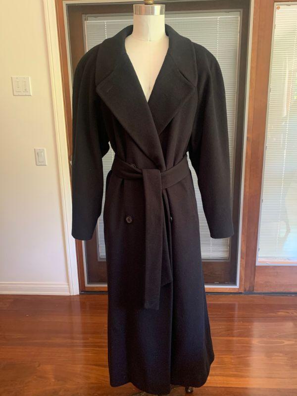 Long black wool coat by Evan Picone, Wide lapels, wrap front, tie belt. Rounded padded shoulders Size 14.