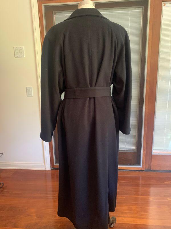 Long black wool coat by Evan Picone, Wide lapels, wrap front, tie belt. Rounded padded shoulders Size 14.