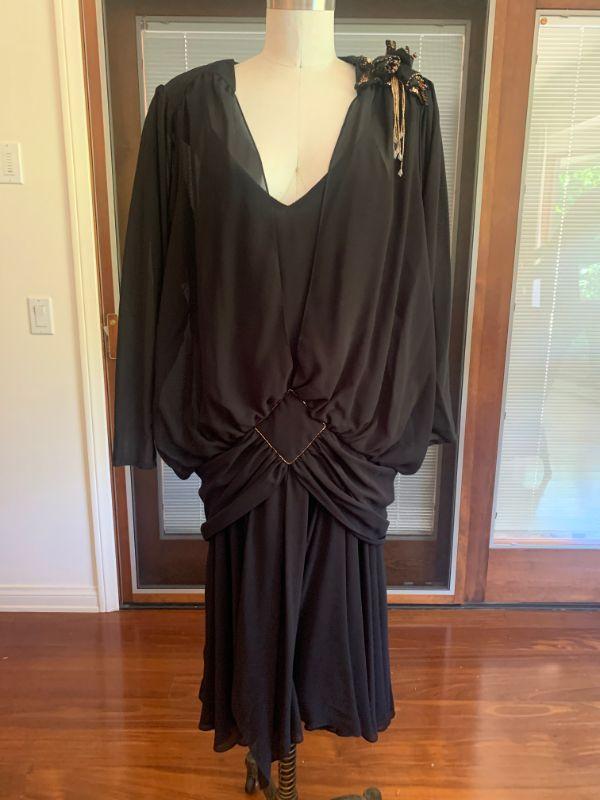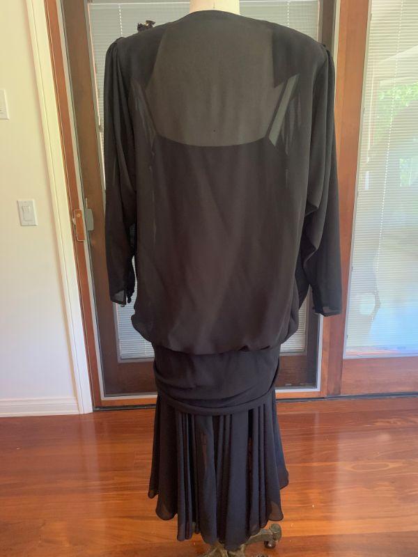 Sheer black fabric draped and gathered into a dropped waist, flouncy skirt. Beaded corsage at the shoulder. Slip liner. Size M