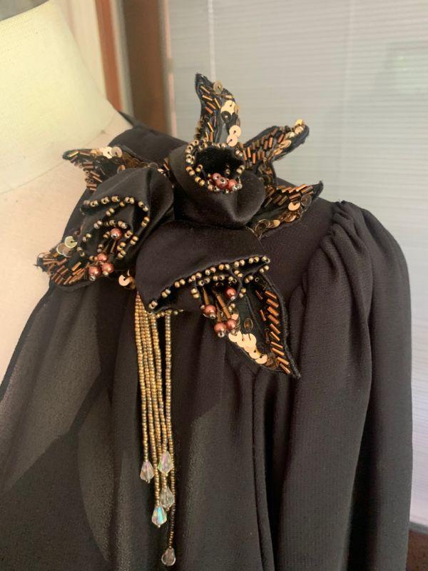 Sheer black fabric draped and gathered into a dropped waist, flouncy skirt. Beaded corsage at the shoulder. Slip liner. Size M