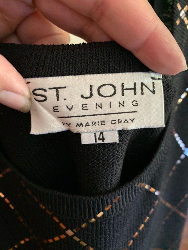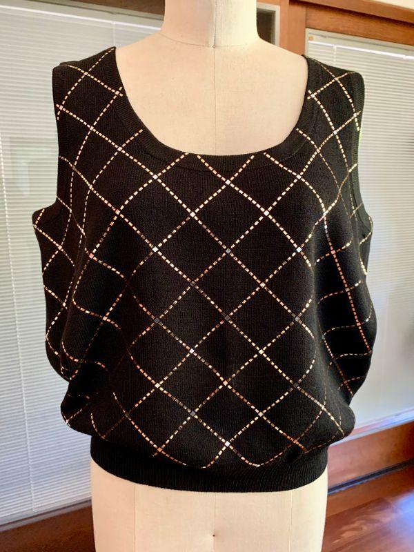 Vintage St John Evening by Marie Gray. Sleeveless shell, black knit with gold metallic ribbon making an argyle pattern. Ribbed hem. Size 14. Good condition.