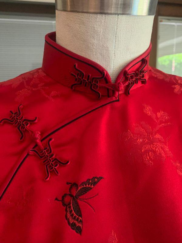 Timeless Asian style. Red silk satin with a small print, Mandarin collar, side zipper. Size M