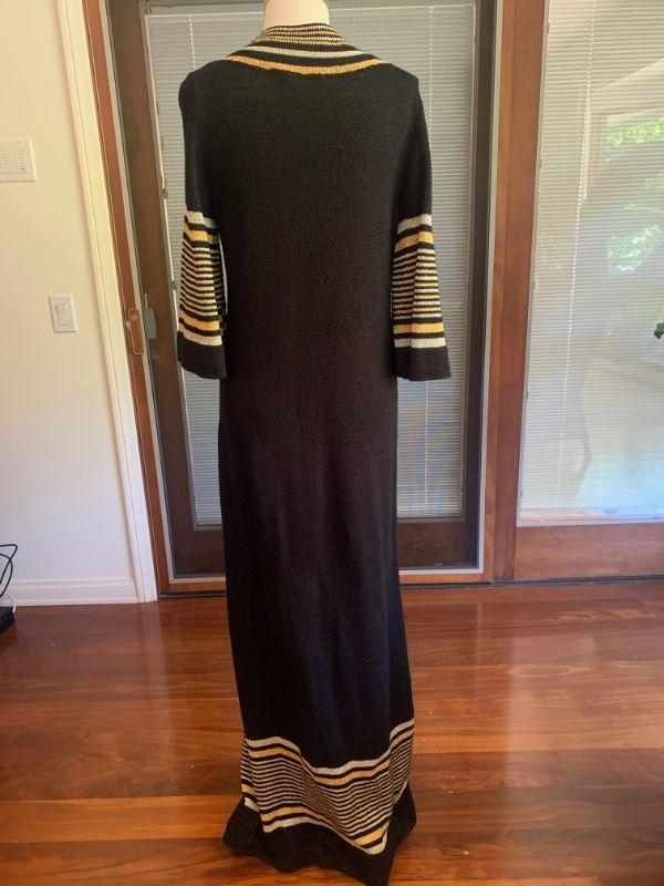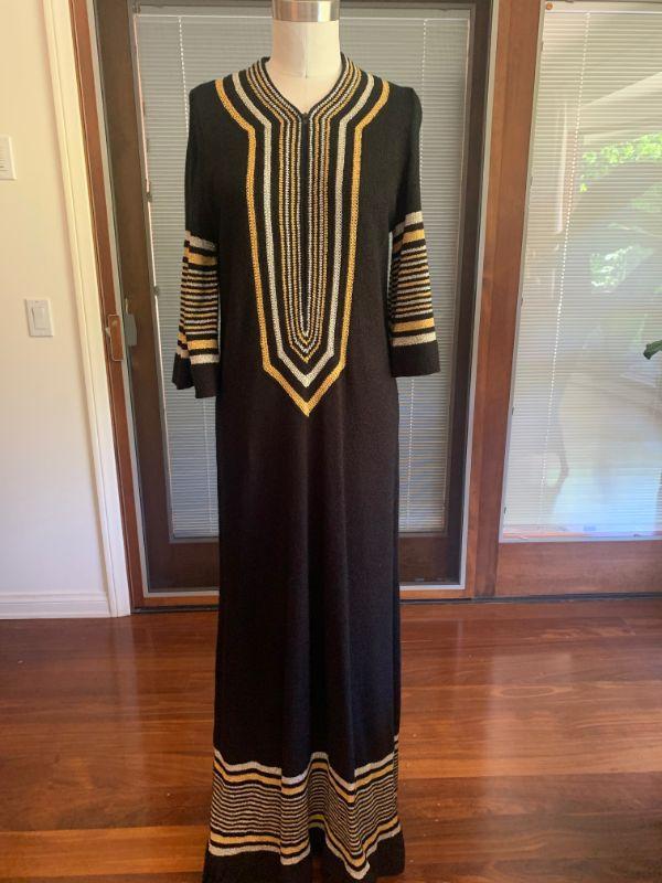 Dramatic vintage caftan. Black knit with silver and gold bands. Size M