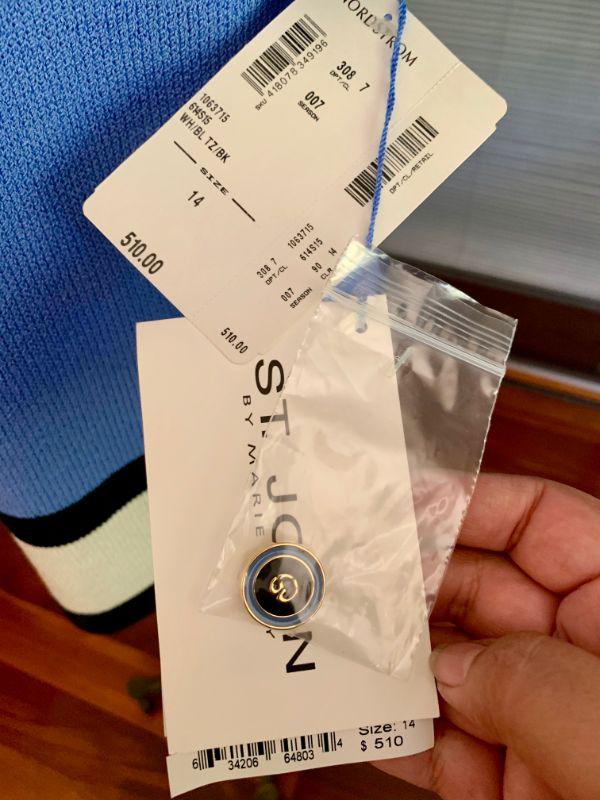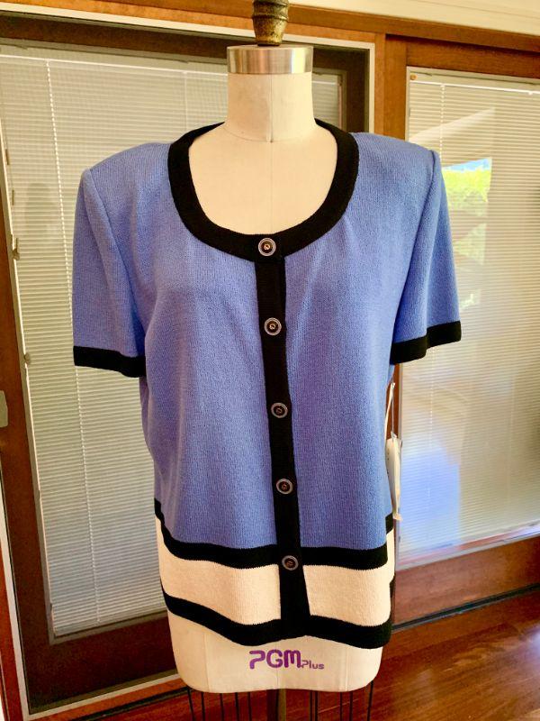 Vintage St John Collection by Marie Gray. Blue/white with black bands, button front, scoop neck, short sleeves. Still has the original tags and extra button. Size 14