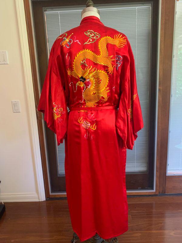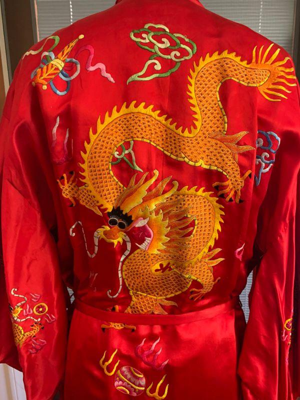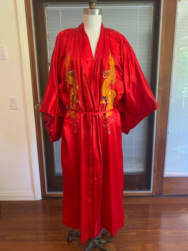 The Girl With the Dragon Robe! Bright red kimono style robe with golden dragons embroidery. Sash belt.