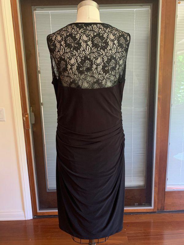 Plunging neckline drapey front sleeveless, lace back insert. Size 16