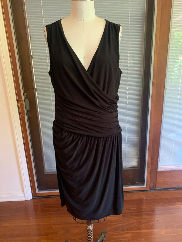 Plunging neckline drapey front sleeveless, lace back insert. Size 16