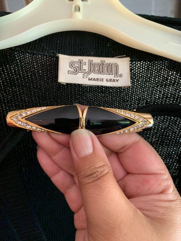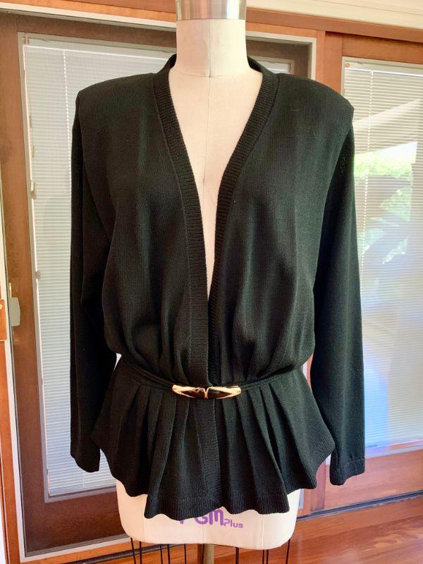 Vintage St John by Marie Gray. Black loose jacket belted with a gold clasp. Padded shoulders. Good condition.