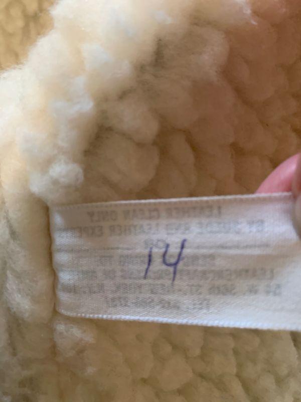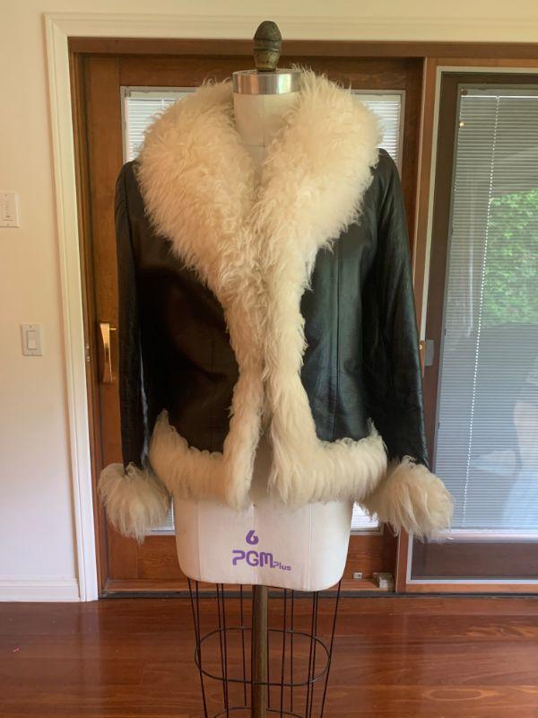 Black leather body & sleeves. Trimmed and lined with faux sherling. Size 14