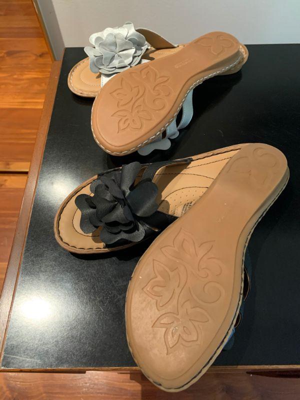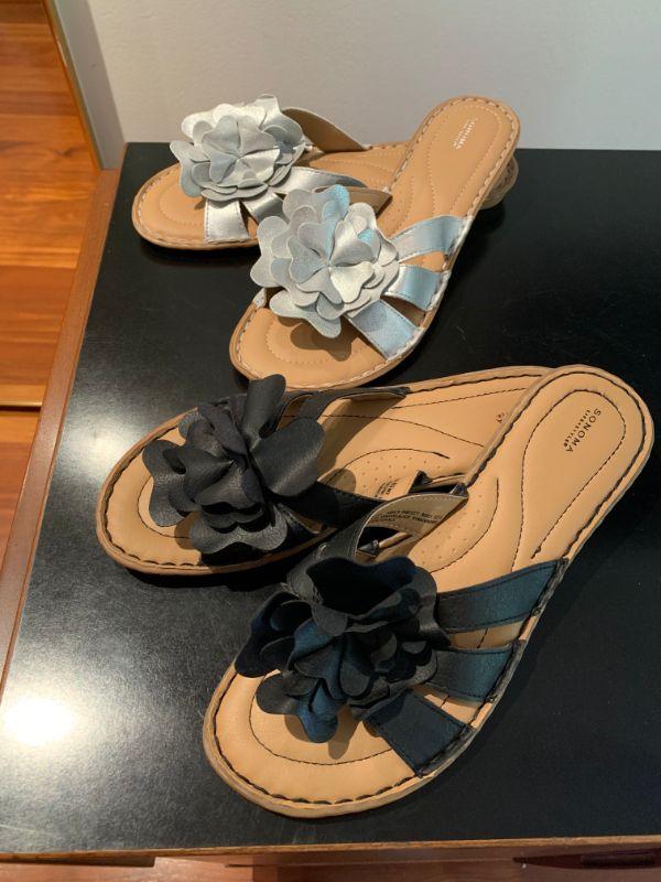 The same shoe in silver and in black. Flat sandals with flowers. Kohls brand. Size 8.5 Barely worn.