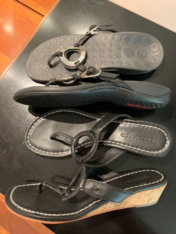 Black sandal by Bernardo. low cork wedge heel white top stitching