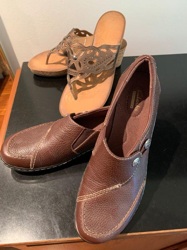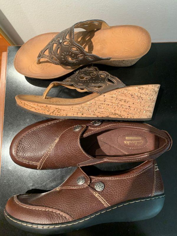 IB 83 TWO PAIRS OF CLARKES LEATHER SHOES THONG WEDGE SIDE BUTTON MOCCASIN