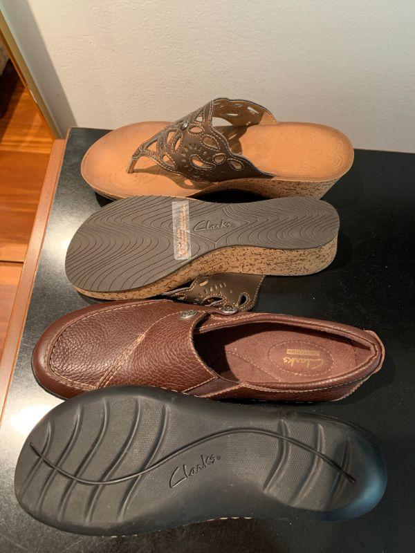 IB 83  TWO PAIRS OF CLARKES LEATHER SHOES THONG WEDGE SIDE BUTTON MOCCASIN