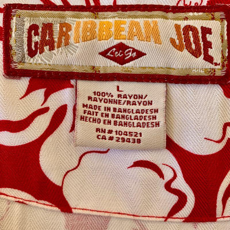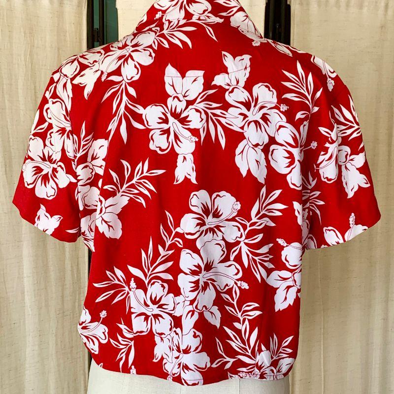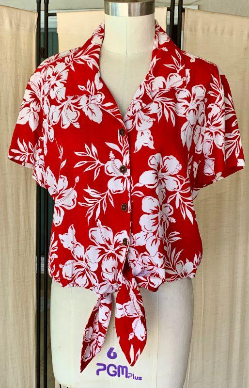 Island time! Red & white tropical print short sleeve shirt with tie front. Size L