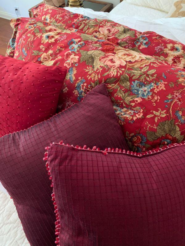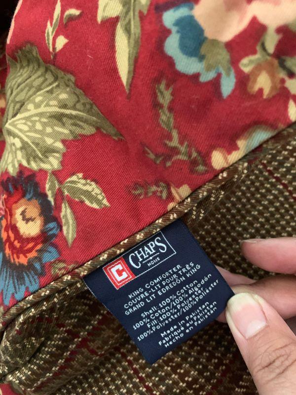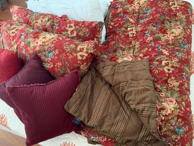 Vintage Ralph Lauren Chaps Home king size poly filled reversible comforter, 2 king size pillows in floral pillow shams plus 2 extra king size pillows. Matching bed skirt. 3 dark red decorator throw pillows.