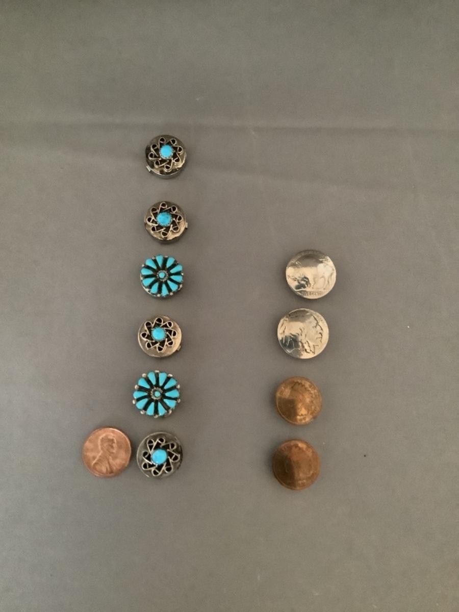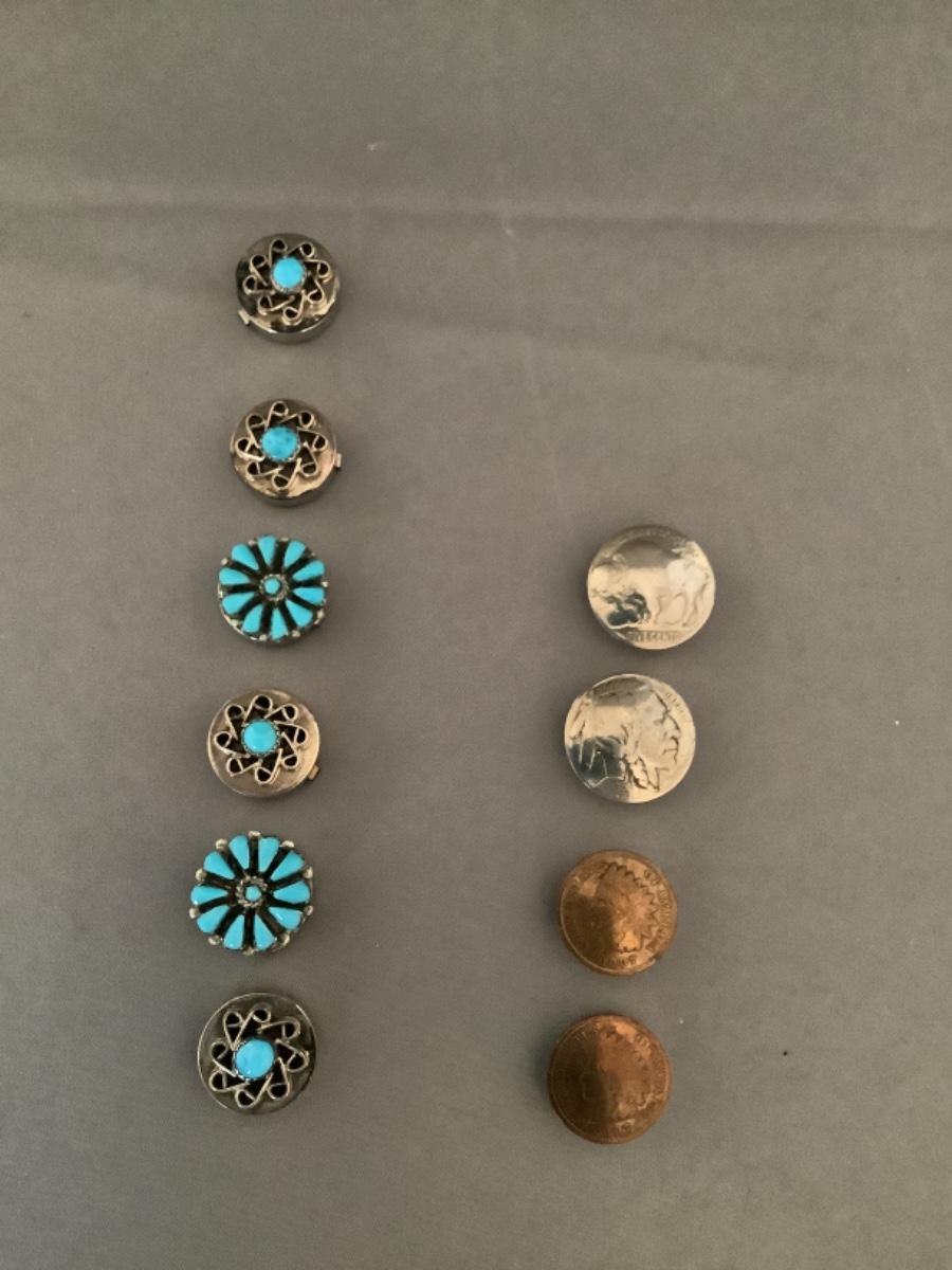 Set of 6 sterling and turquoise button covers with 4 sterling Indian head pennies and buffalo nickel button covers