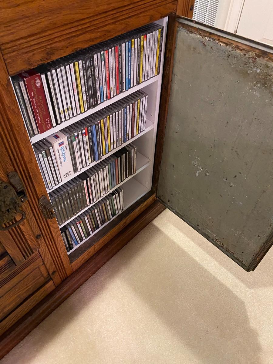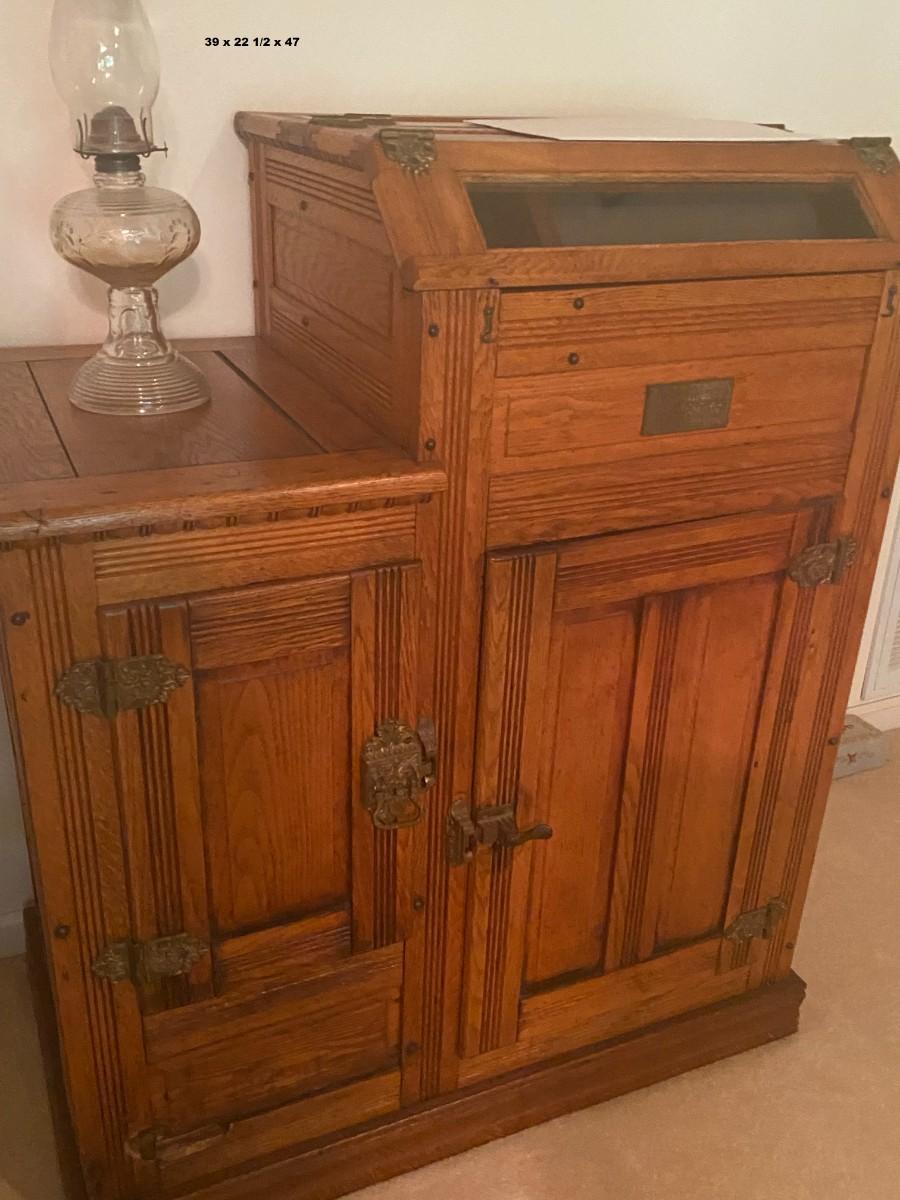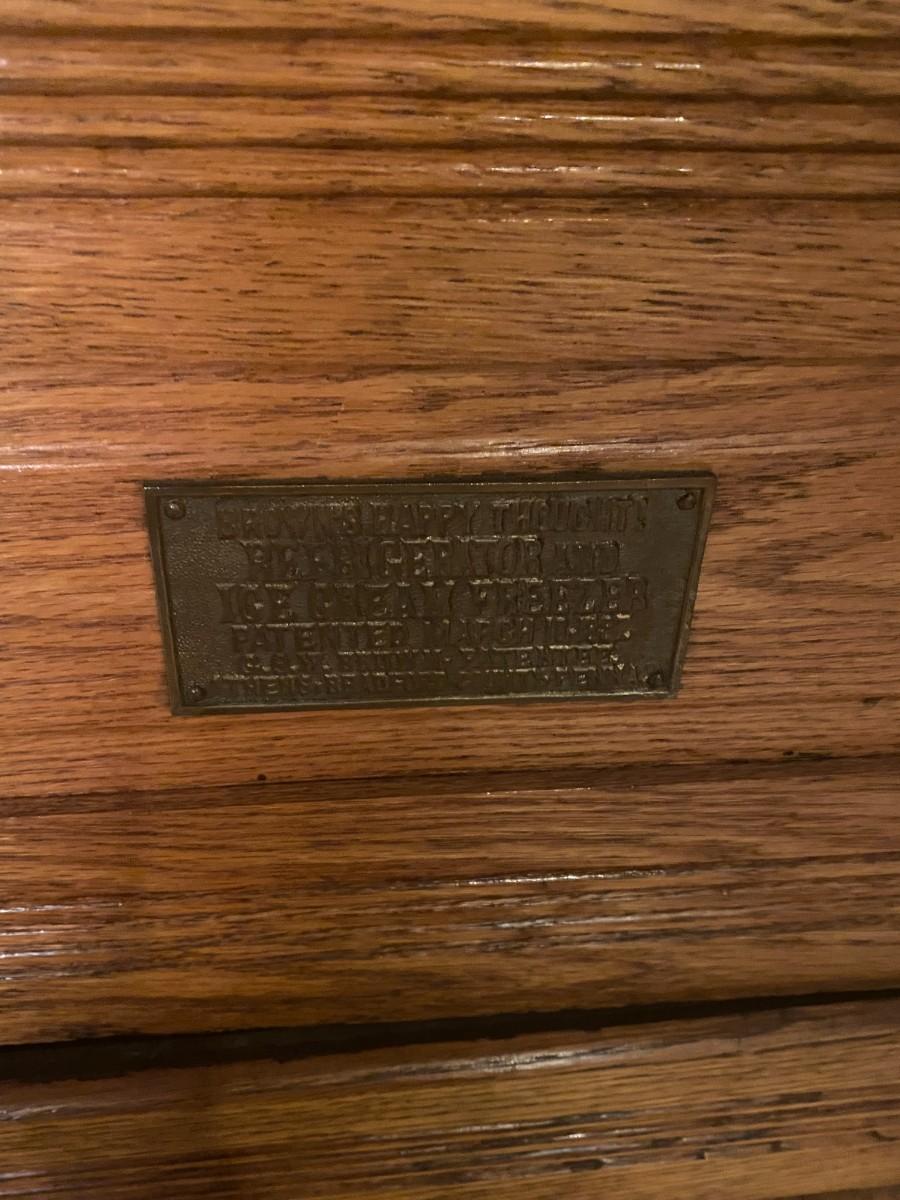 Rare item. Brown's Happy Thoughts Refrigerator Co.. 39 x 22 1/2 x 47. Bottom has soft spot, and it looks like it has rotted. Currently holds CDs.