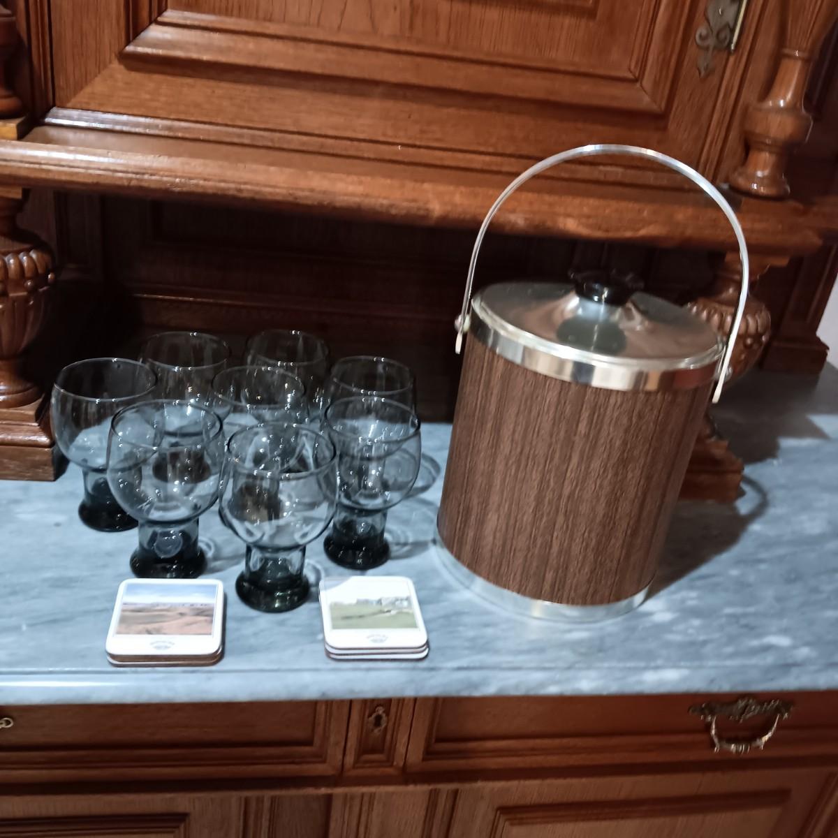 ICE BUCKET, COASTERS AND DRINKING GLASSES