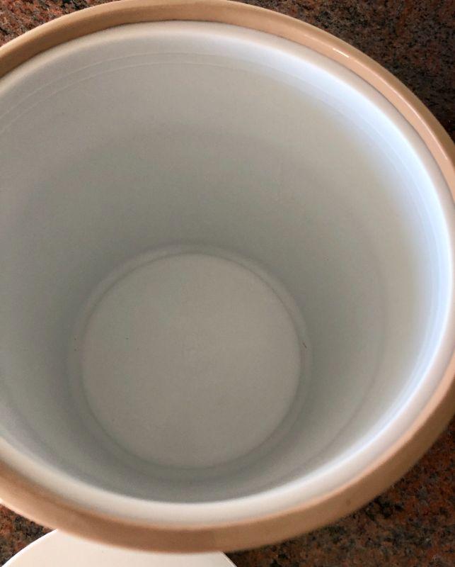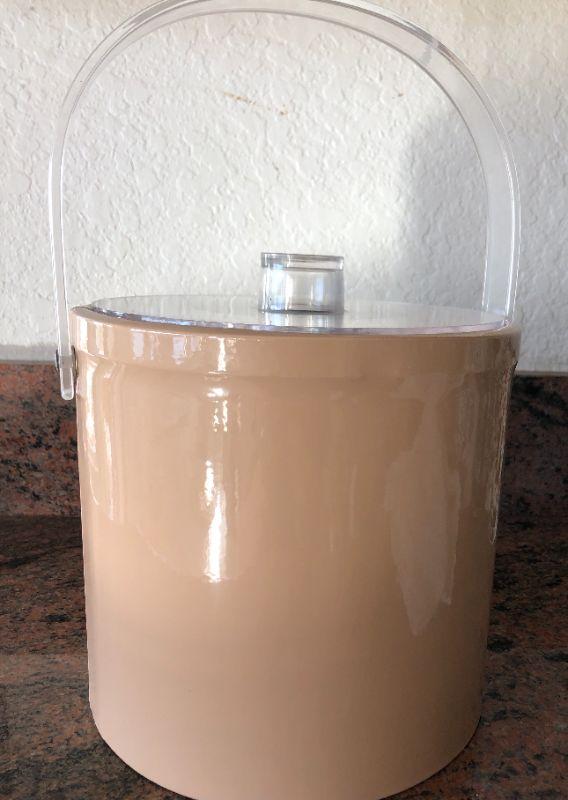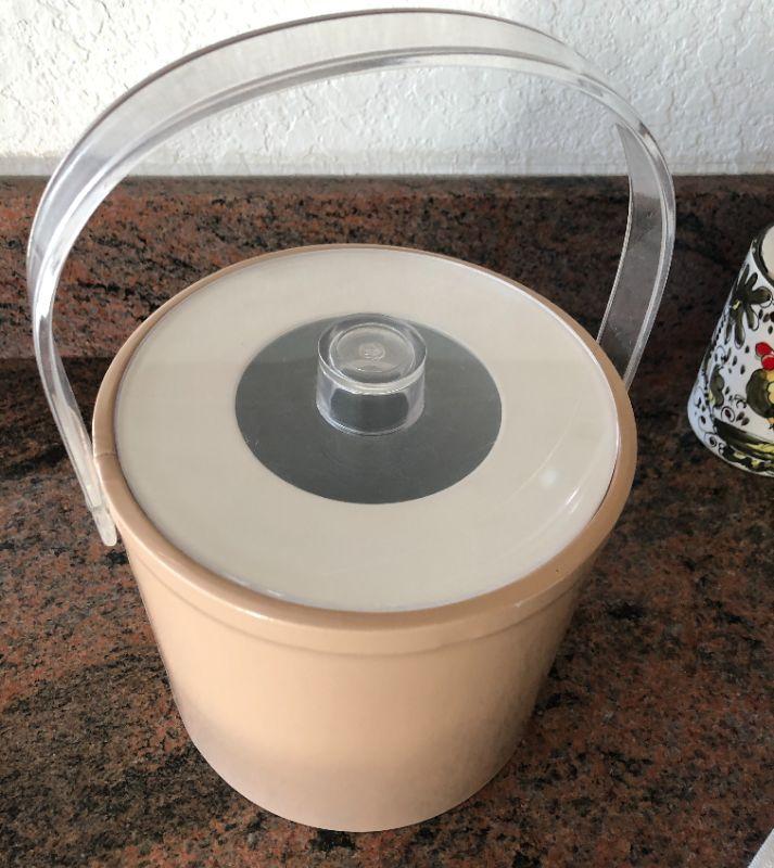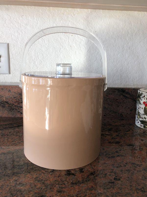 Retro plastic ice bucket. Kind of a beige peachy color, clear handle. Good condition.