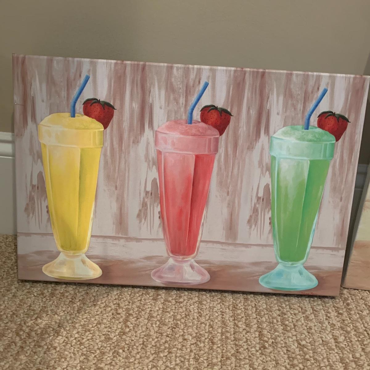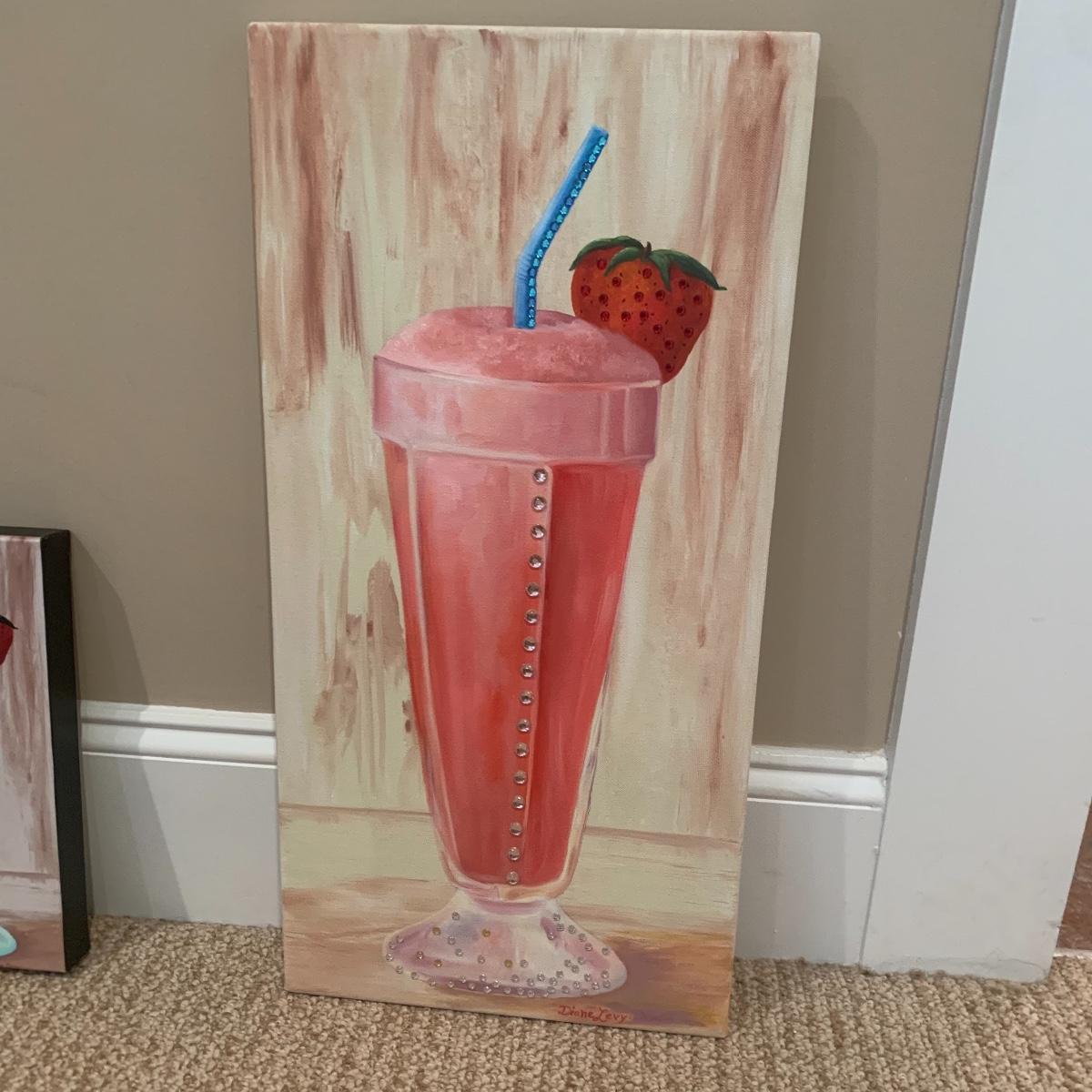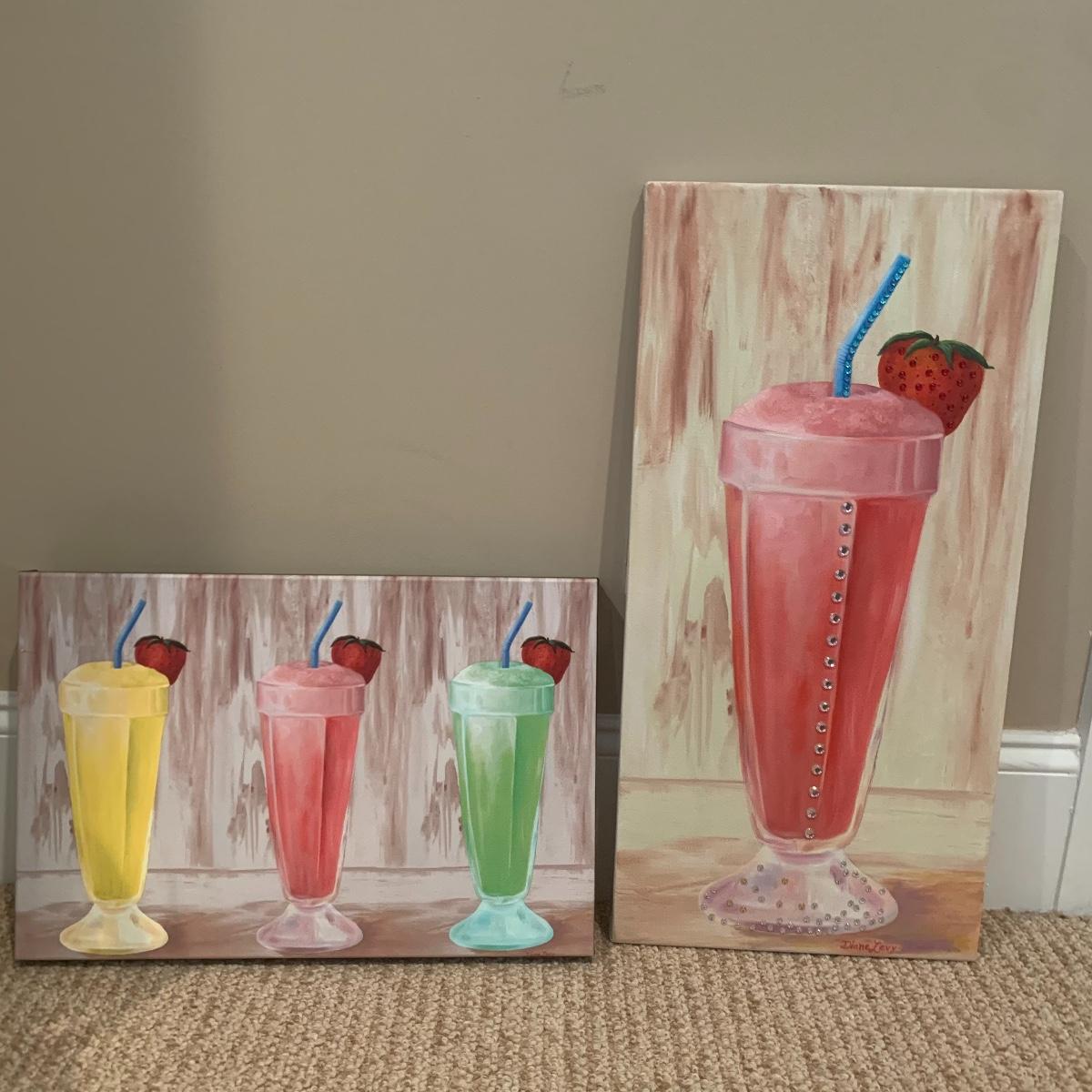 Two paintings of ice cream floats with the smaller one bing of three different flavors in acrylic on canvas and measuring 18”x12”. The larger one has some extra bling added to it and is signed by estate owner Diane Levy and measures 12” x24”. Shipping available.