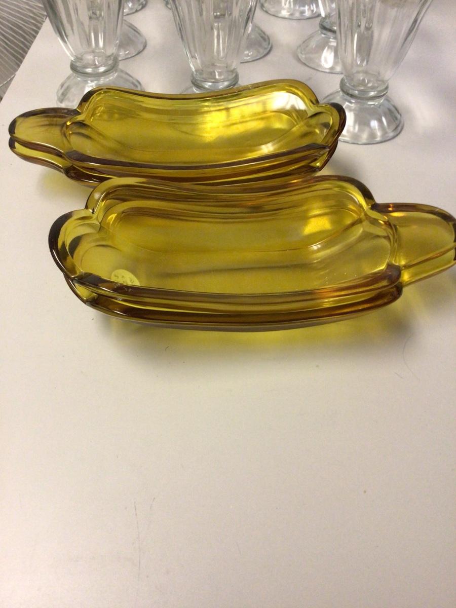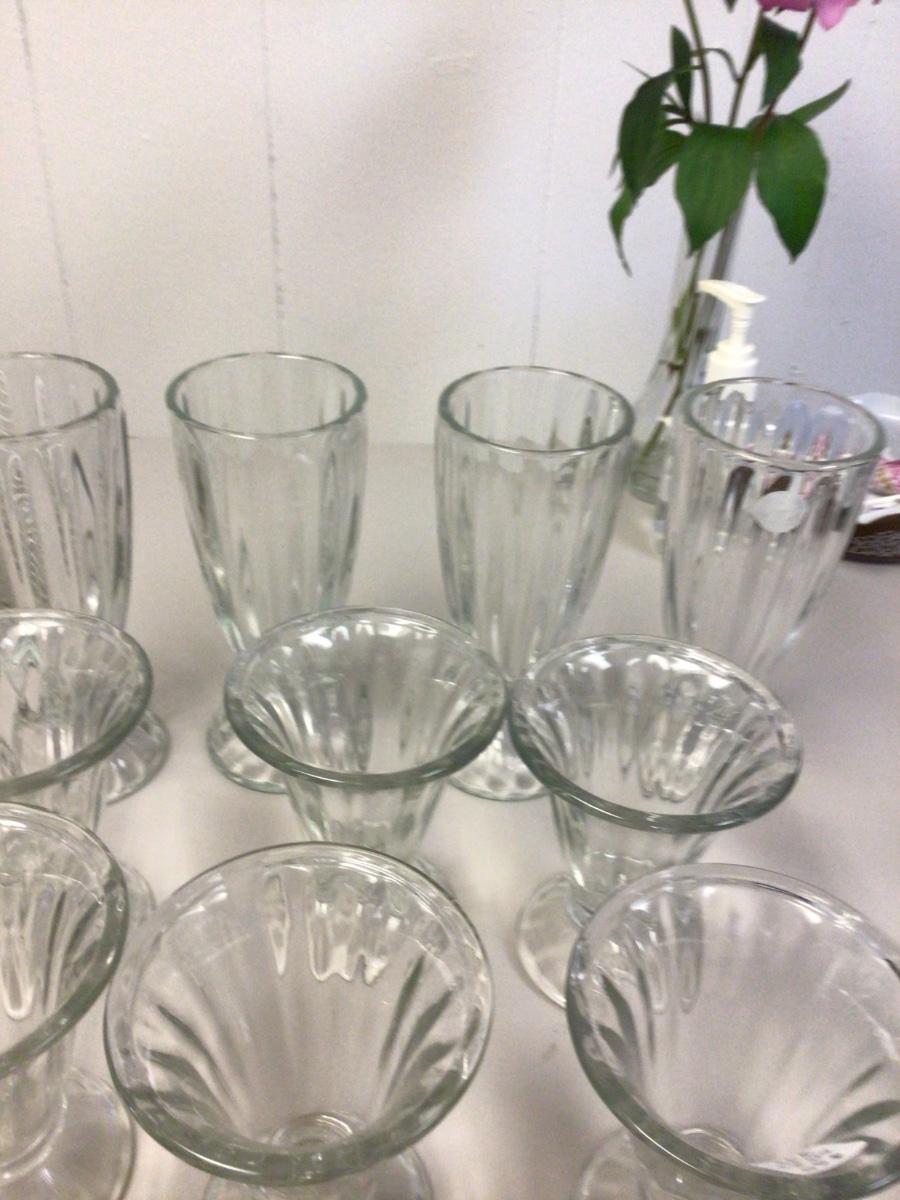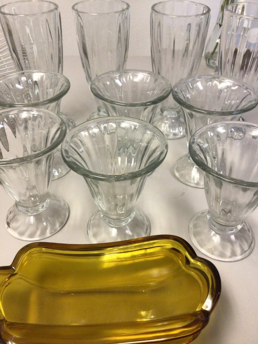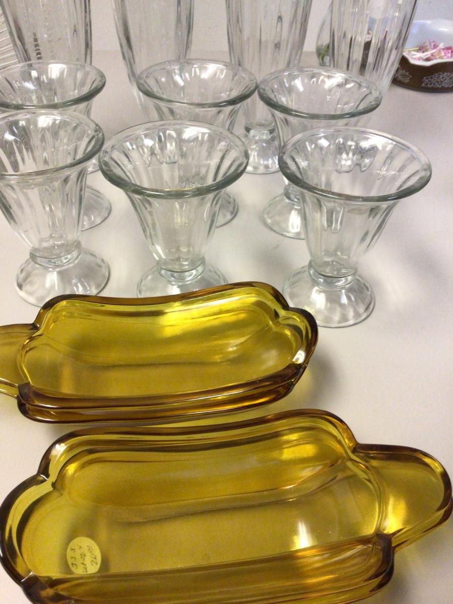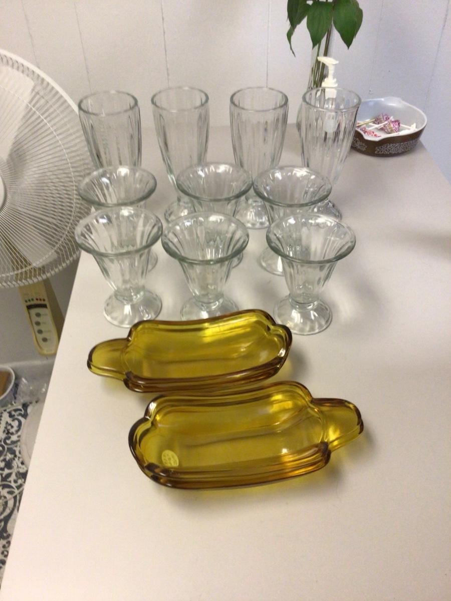 This is a great lot of ice cream related glassware. There are shake glasses (4), ice cream sundae glasses (6), and banana split amber glass plates (4).