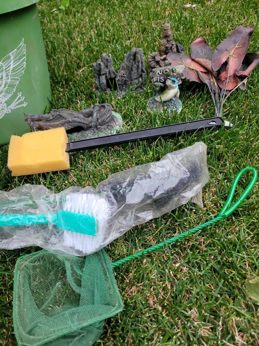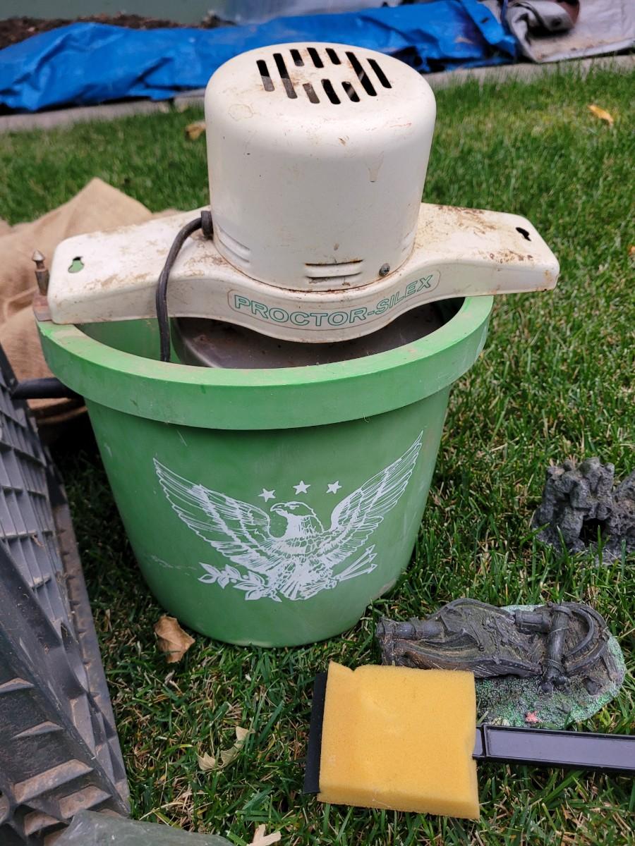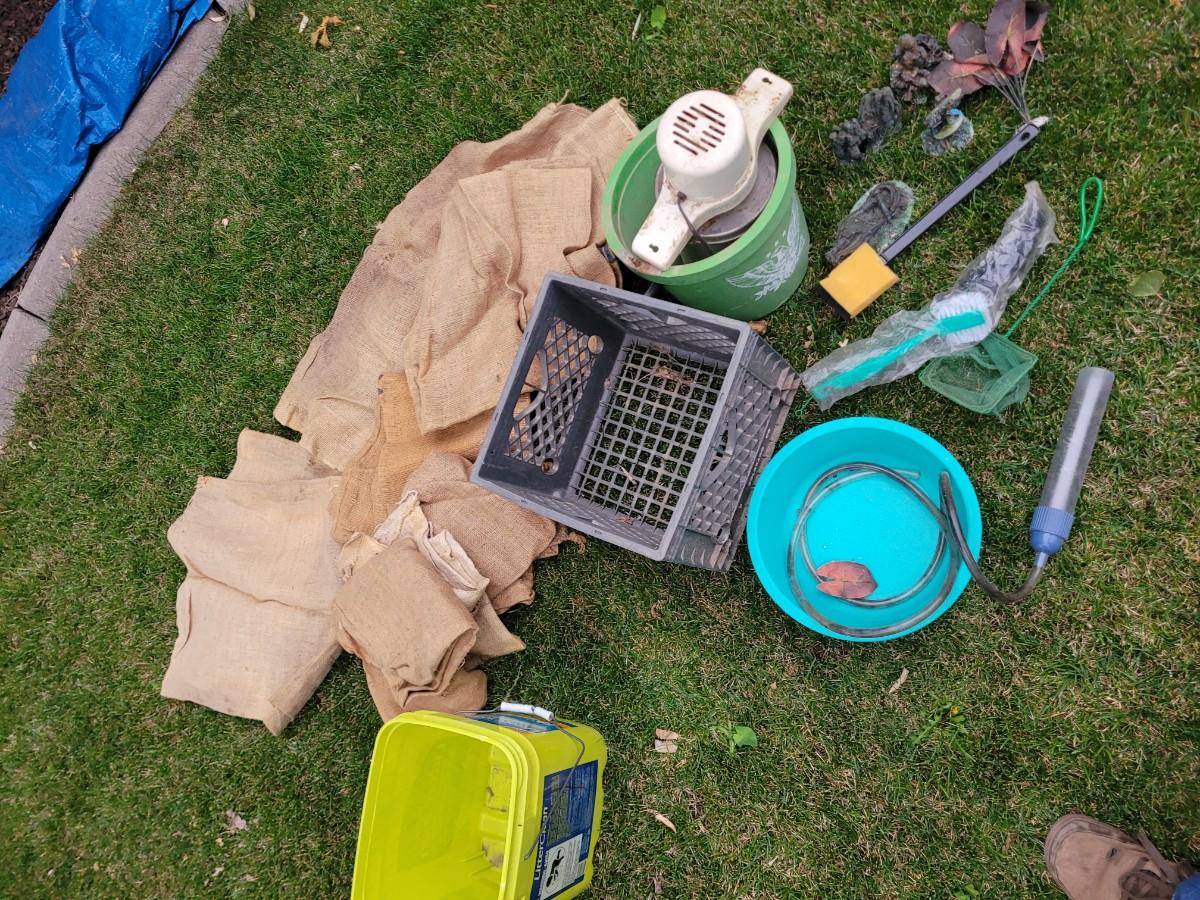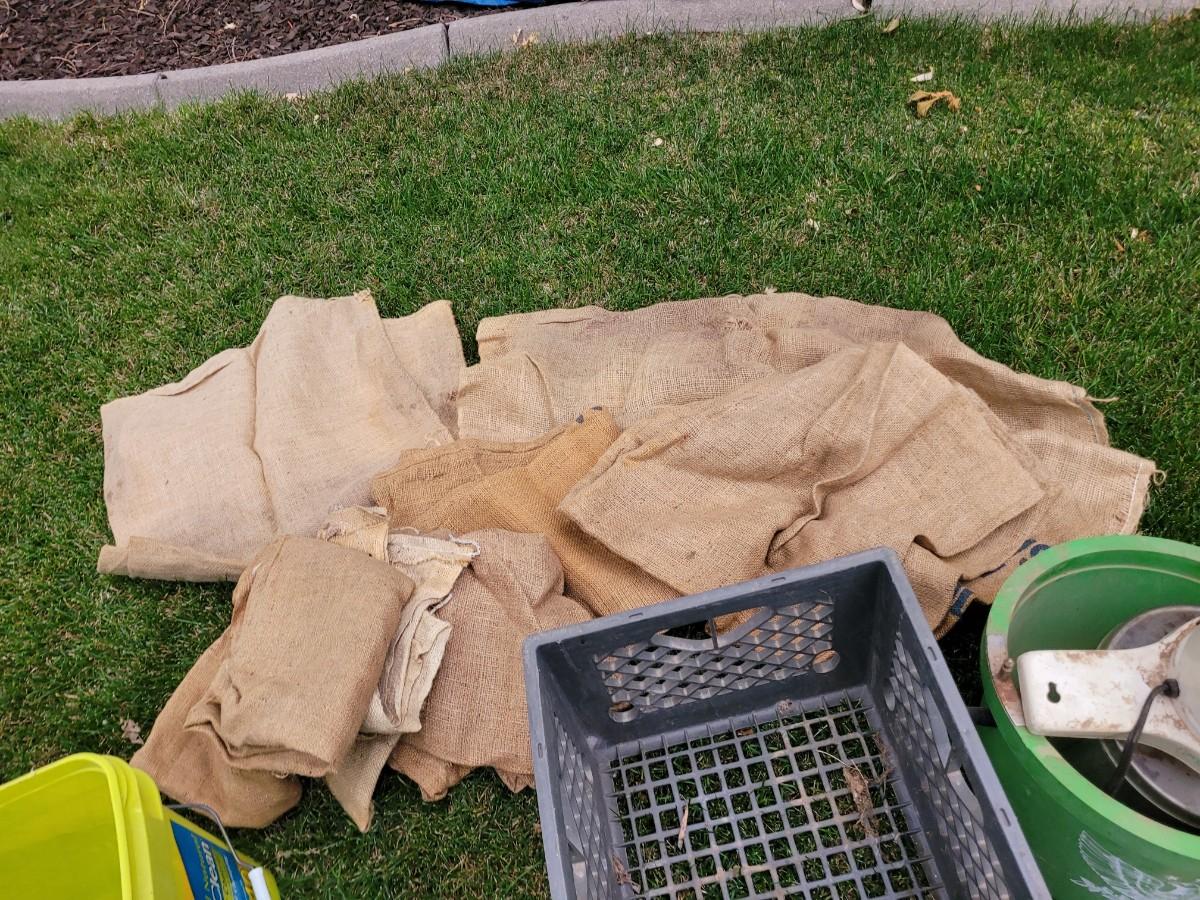 Ice cream maker, burlap bags, fish tank items, milk crate