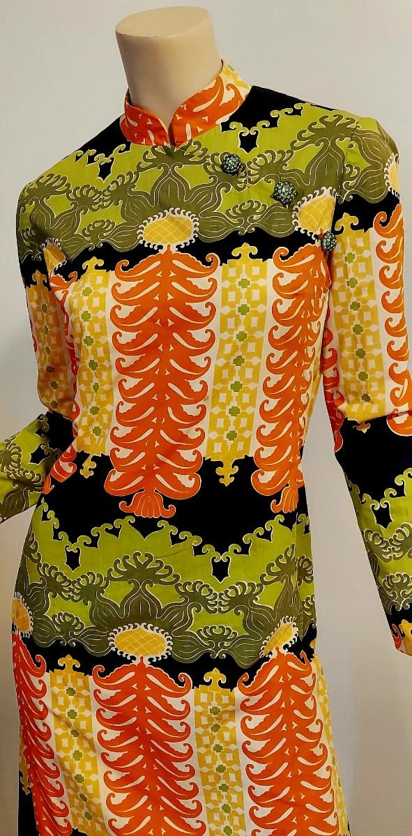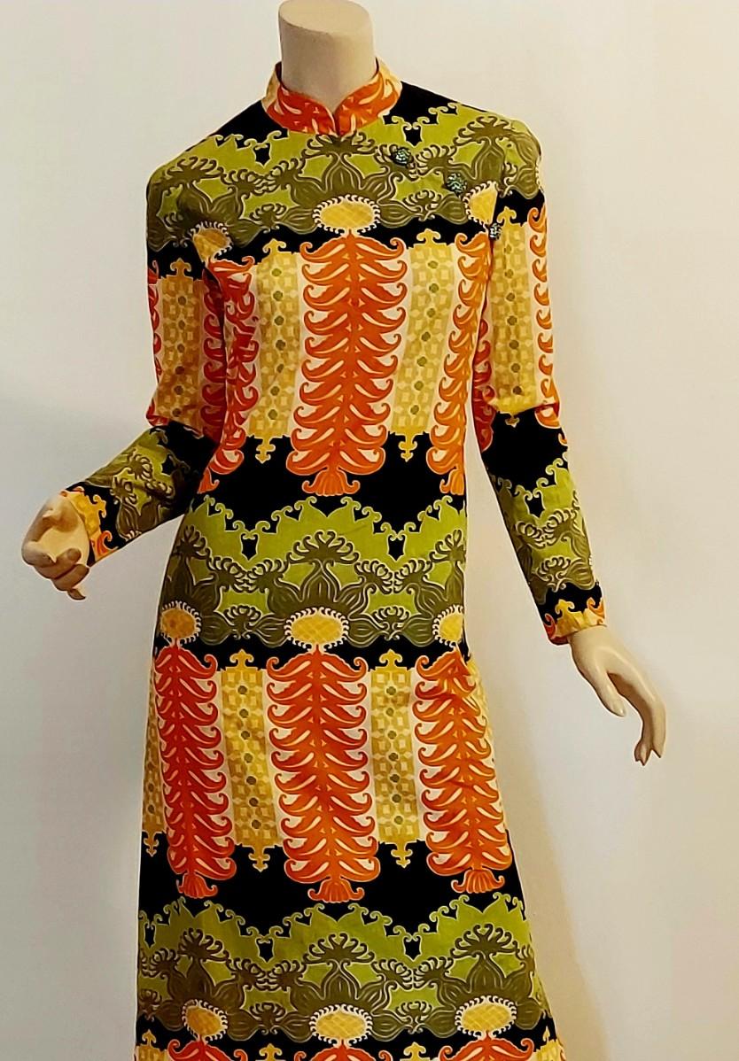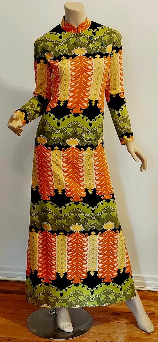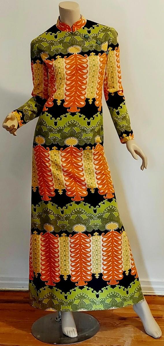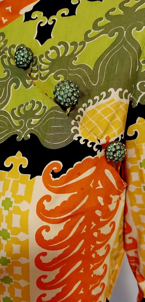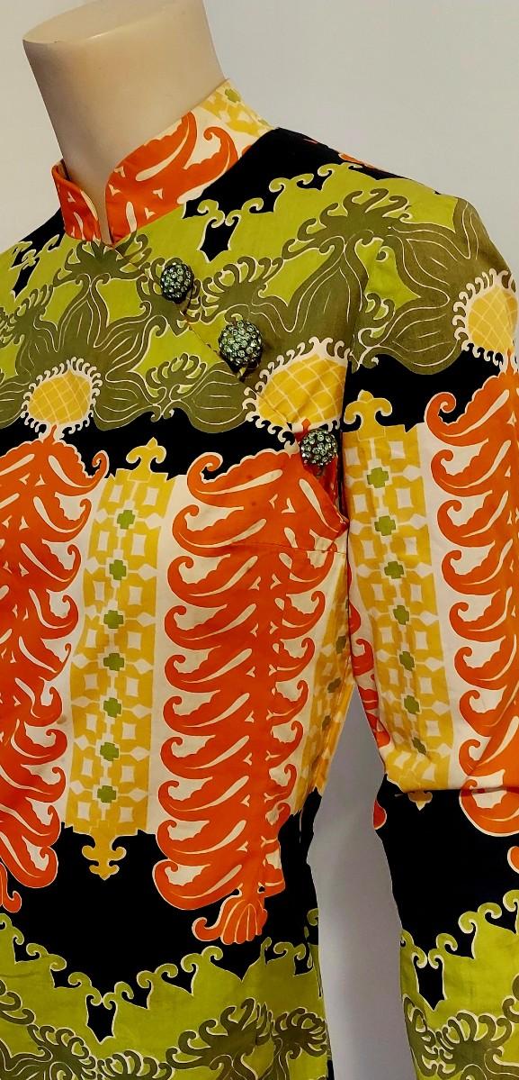 An Iconic Hostess Cheongsam Quipao maxi Elizabeth Arden 5th Ave Couture ,Tailored by hand in Bangkok. Cotton/Silk Hand Screened,and adorned by Crystal Dome Buttons.