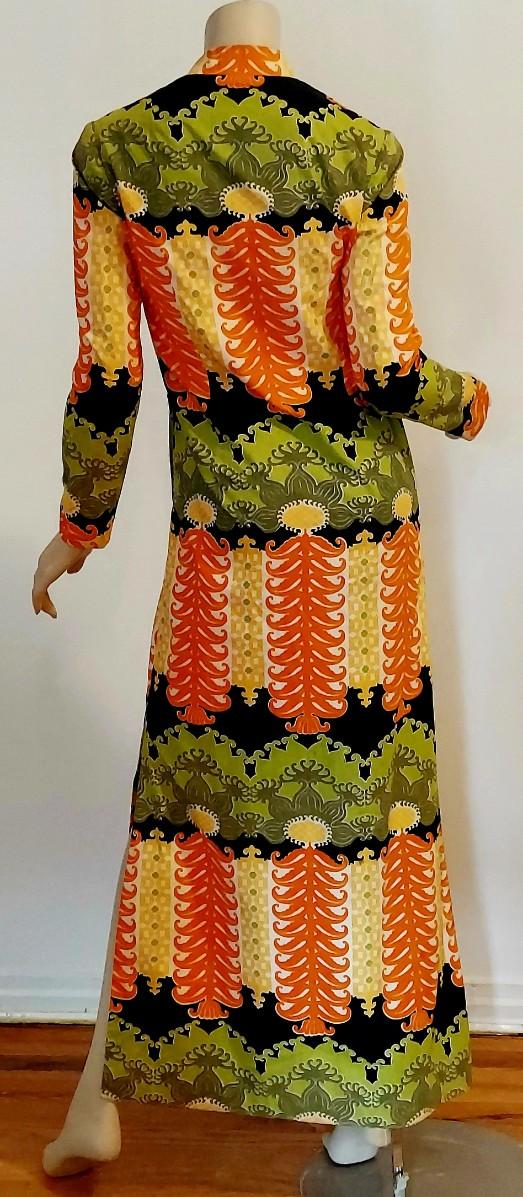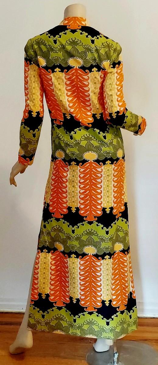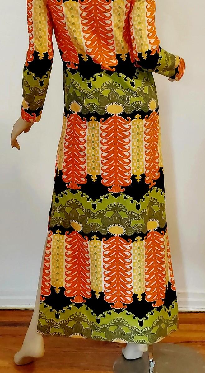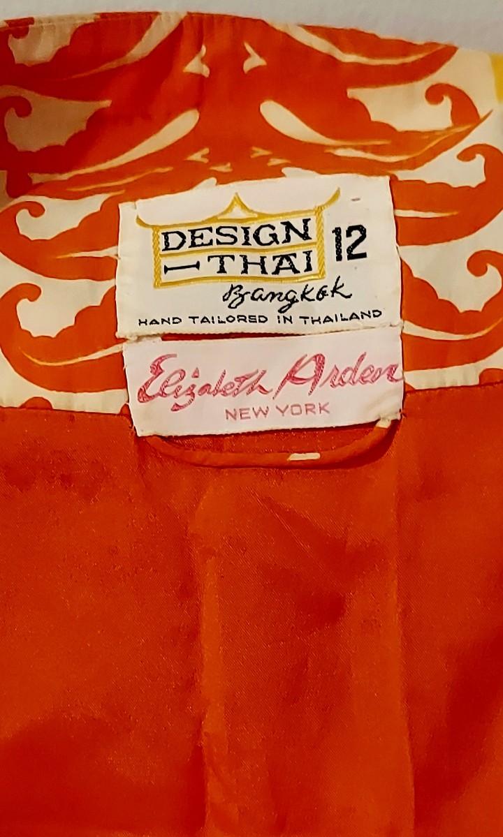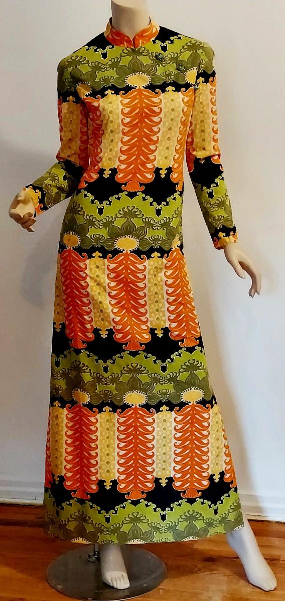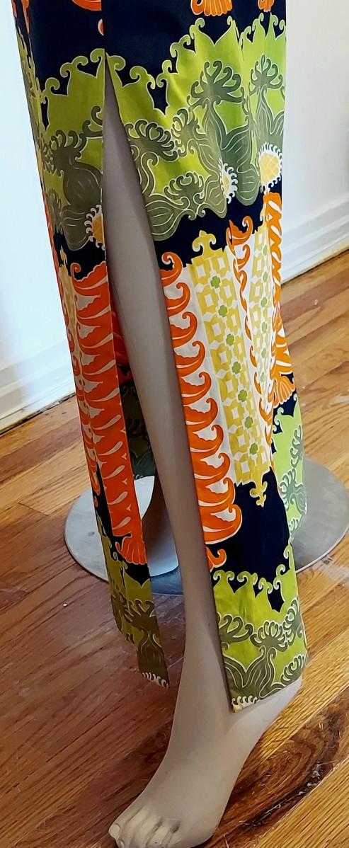 An Iconic Hostess Cheongsam Quipao maxi Elizabeth Arden 5th Ave Couture ,Tailored by hand in Bangkok. Cotton/Silk Hand Screened,and adorned by Crystal Dome Buttons.