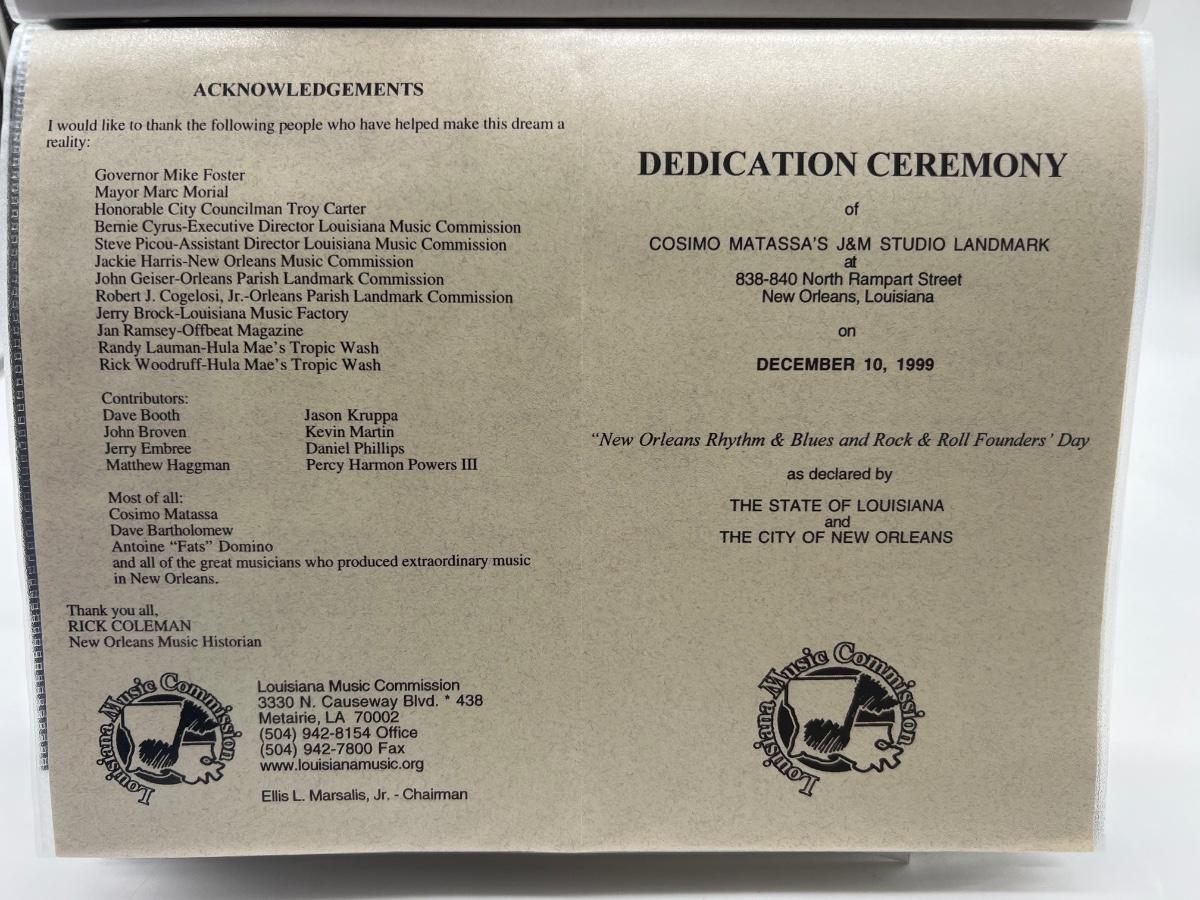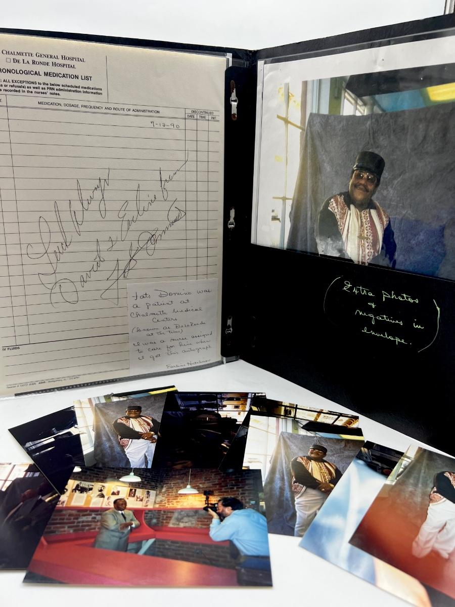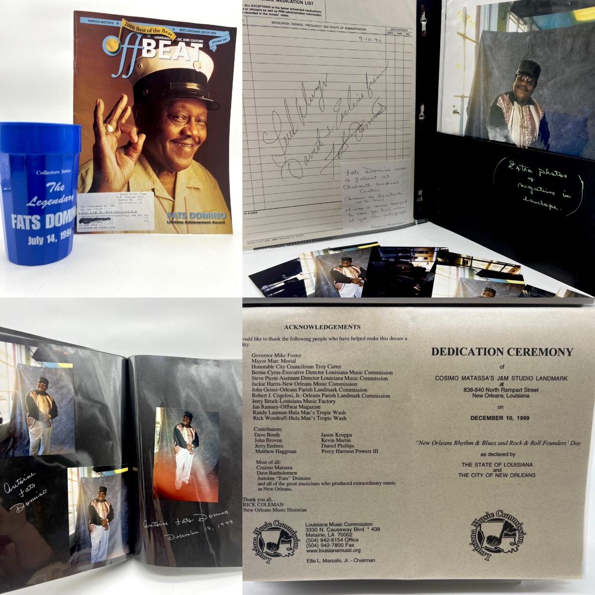 New Orleans Iconic FAT’S DOMINO Commemoration Lot. Includes a hand written note & autograph he gifted a nurse while in the hospital. Also includes pictures and stories about events from employees of J & M Music Shop.