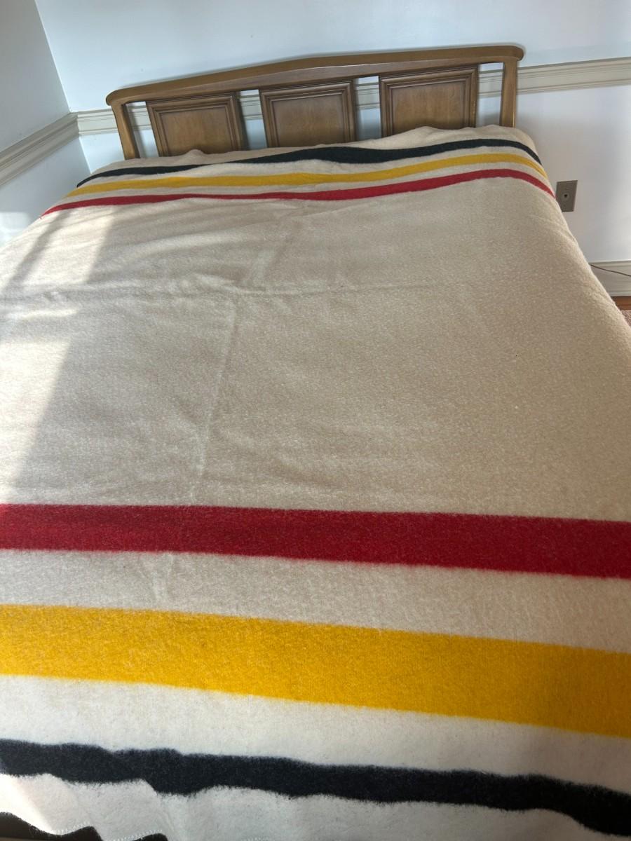 No tag however, the colors and arrangement would suggest it could be made by Pendelton or Hudson Bay. Queen size, maybe a little larger., no holes great condition for its age.