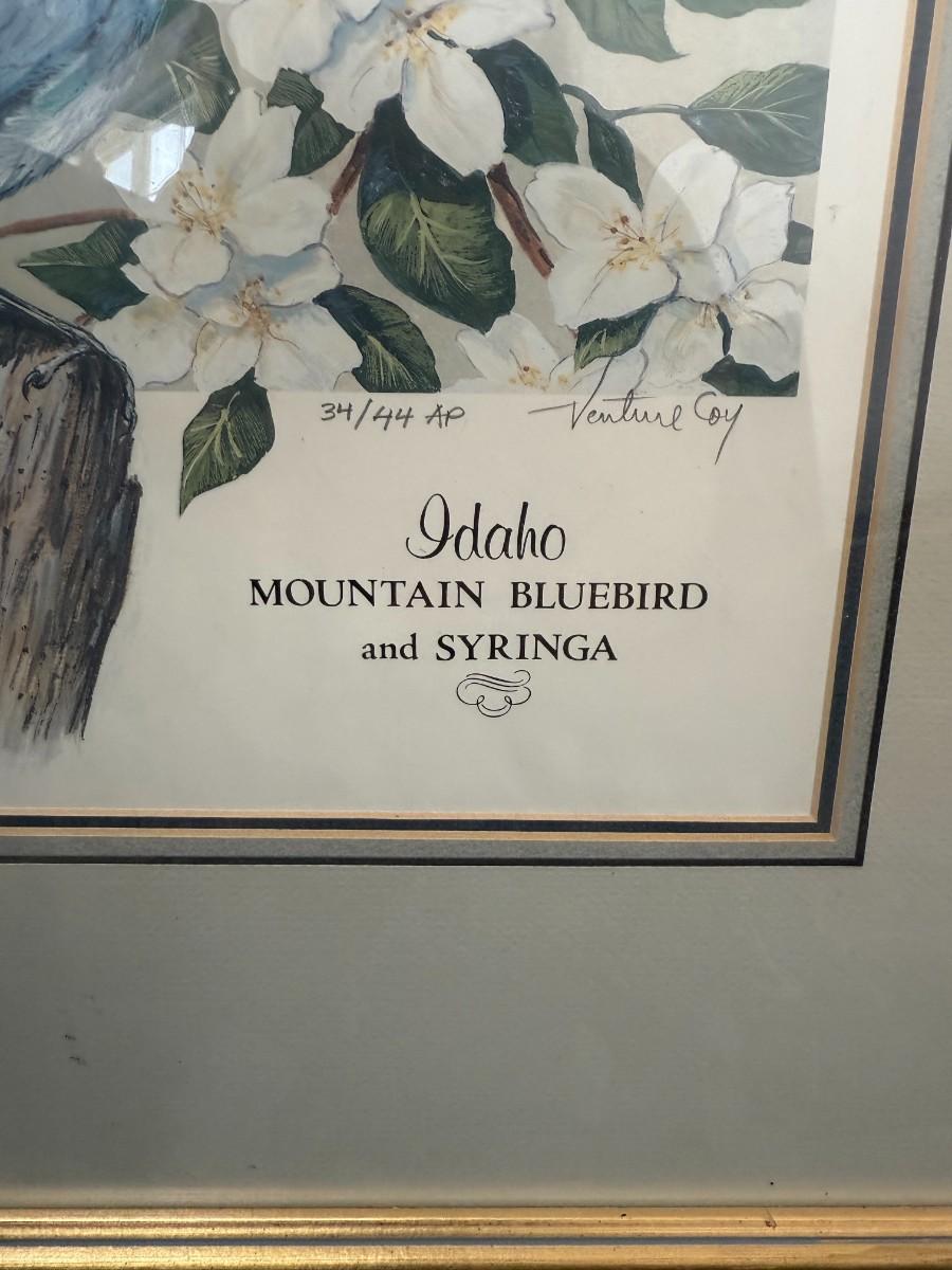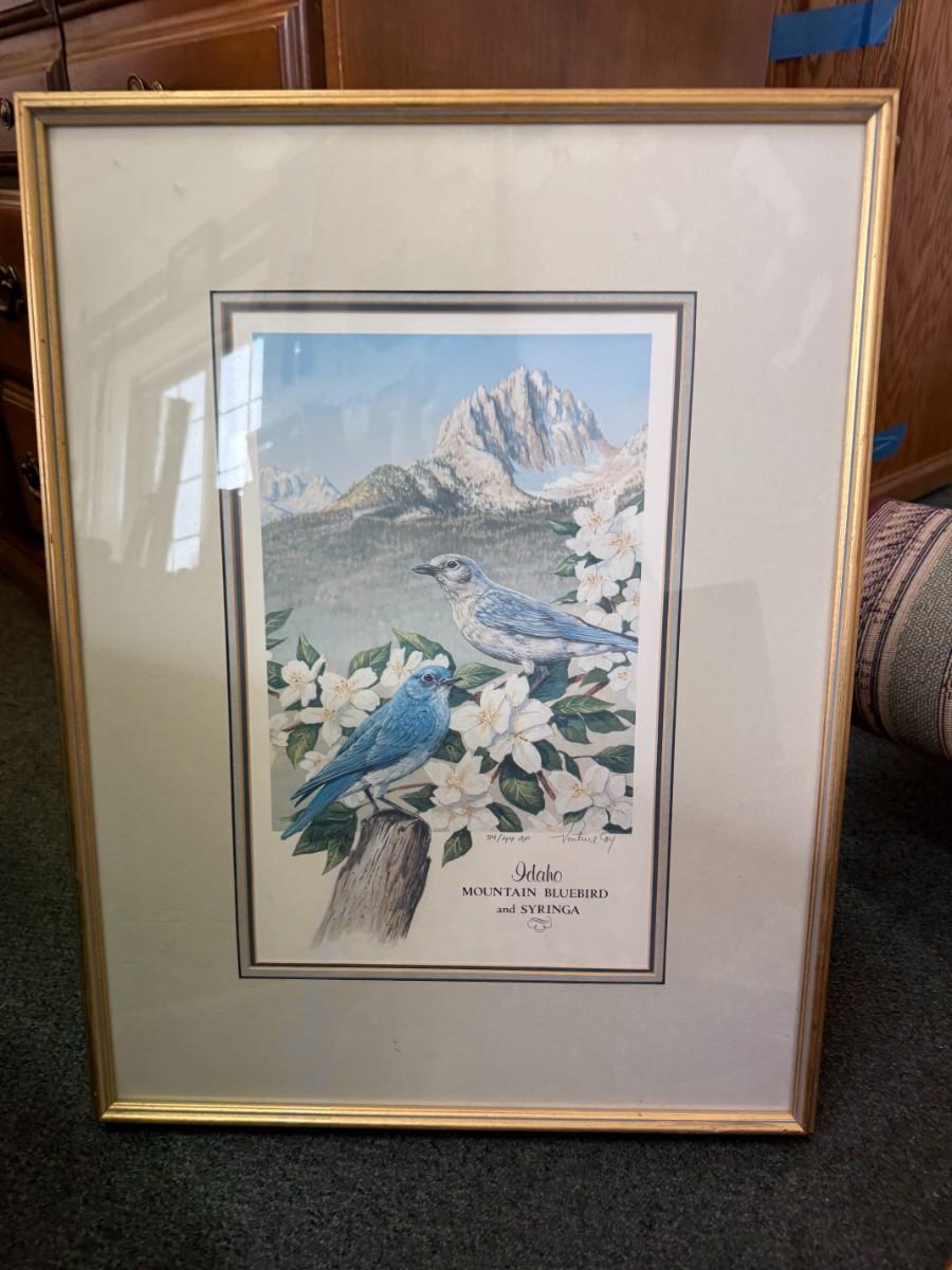 A beautifully painted and signed depiction of Idaho's mountain bluebird, perfect for art lovers and collectors.