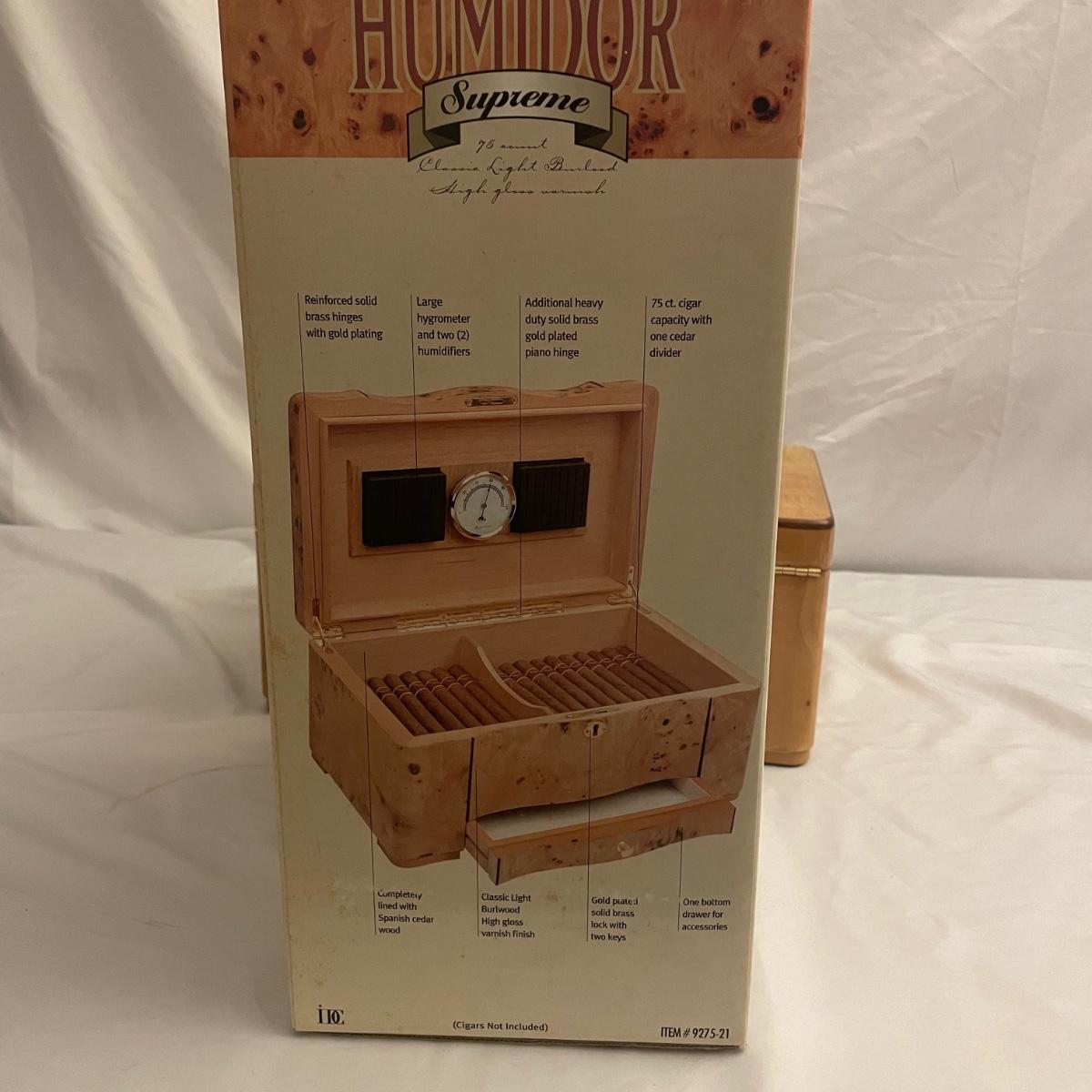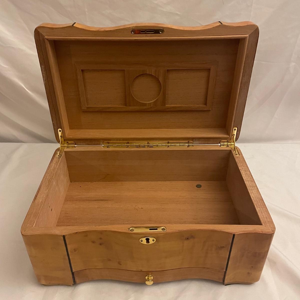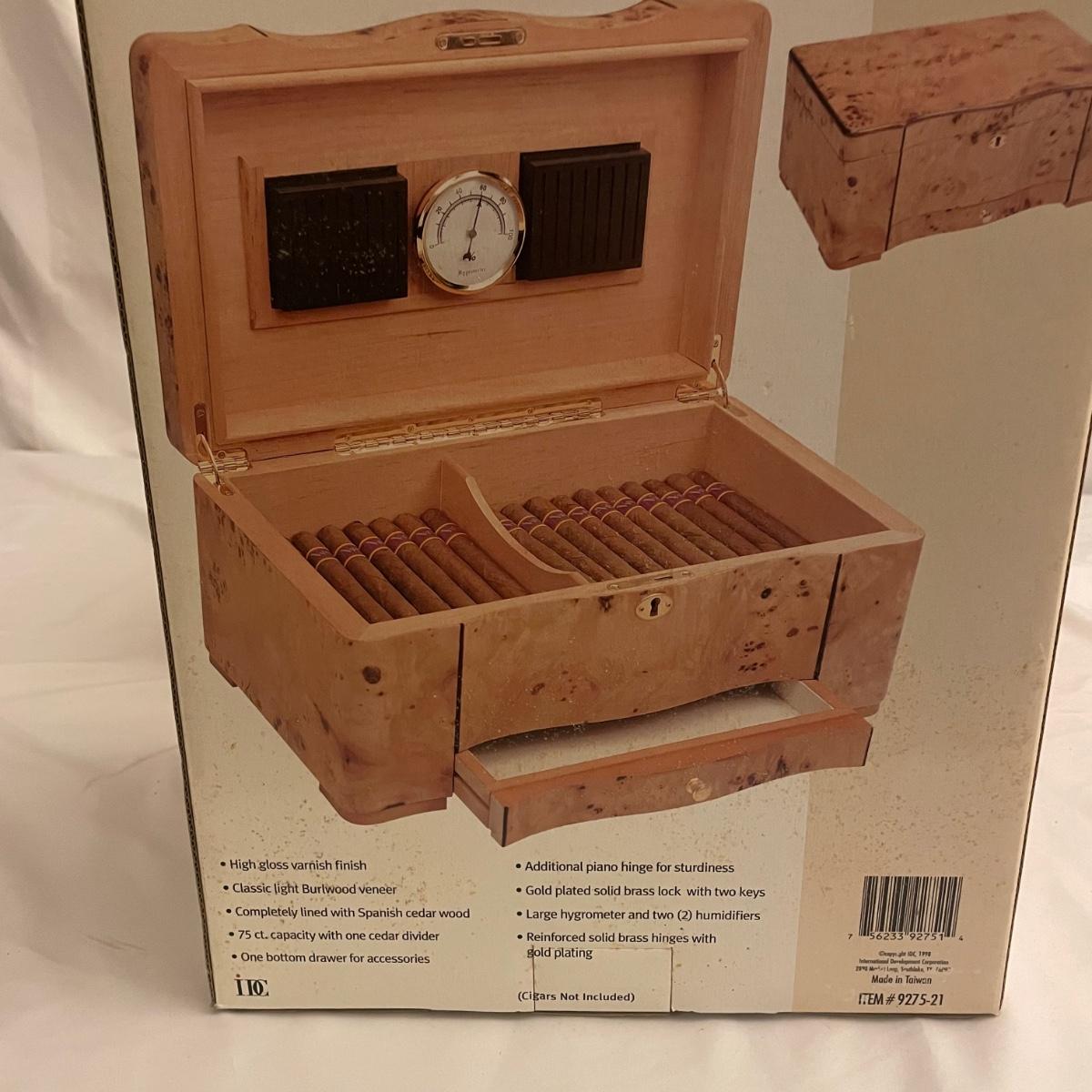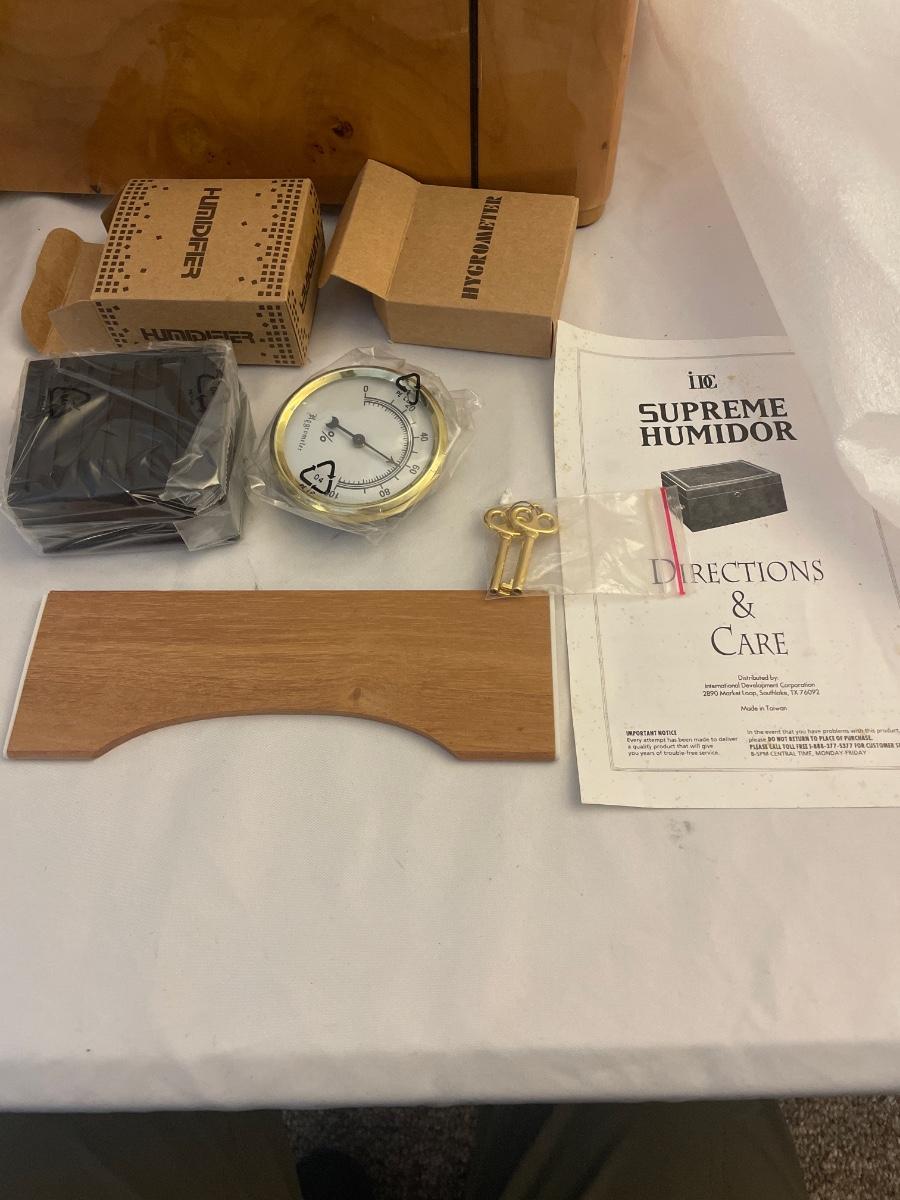 This IDC cedar lined humidor comes with keys and measures 15” x 9.5” x 7”. All parts are included.