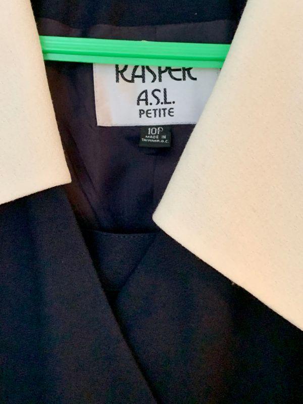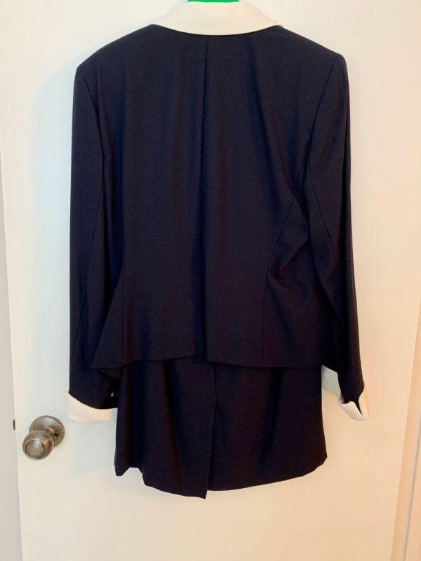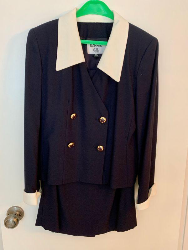 Size 10 Petite Navy blue double breasted jacket w/white collar & cuffs, Skirt has back vent. Label Kaiser A S L