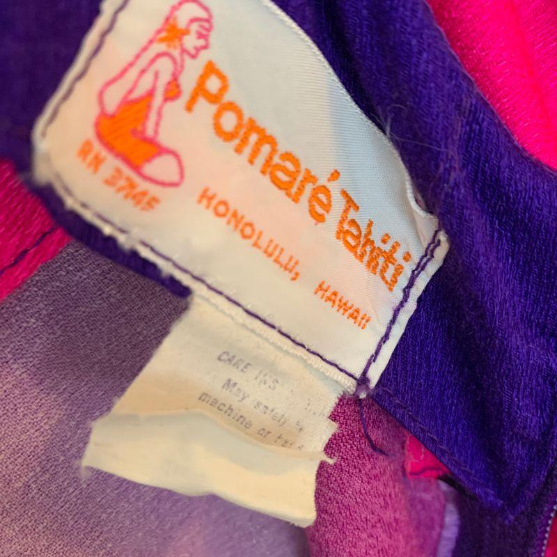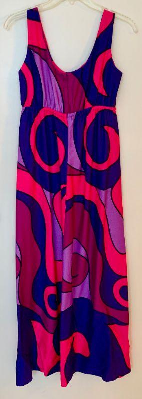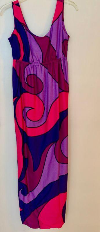 size 7 from Pomare Tahiti Honolulu Hawaii. Long dress, purple/pink psychedelic print. Sleeveless, scoop neck, empire waist, full back.