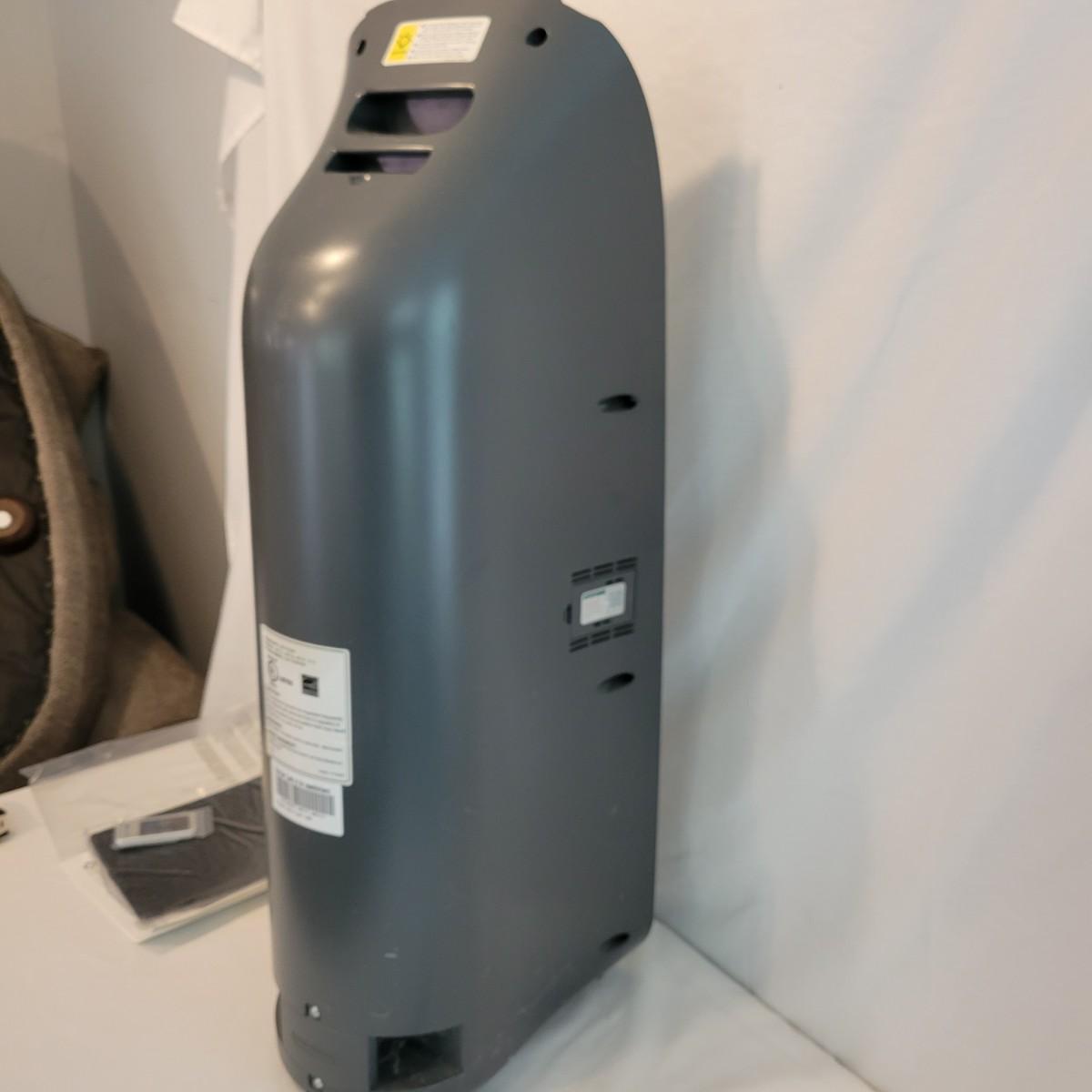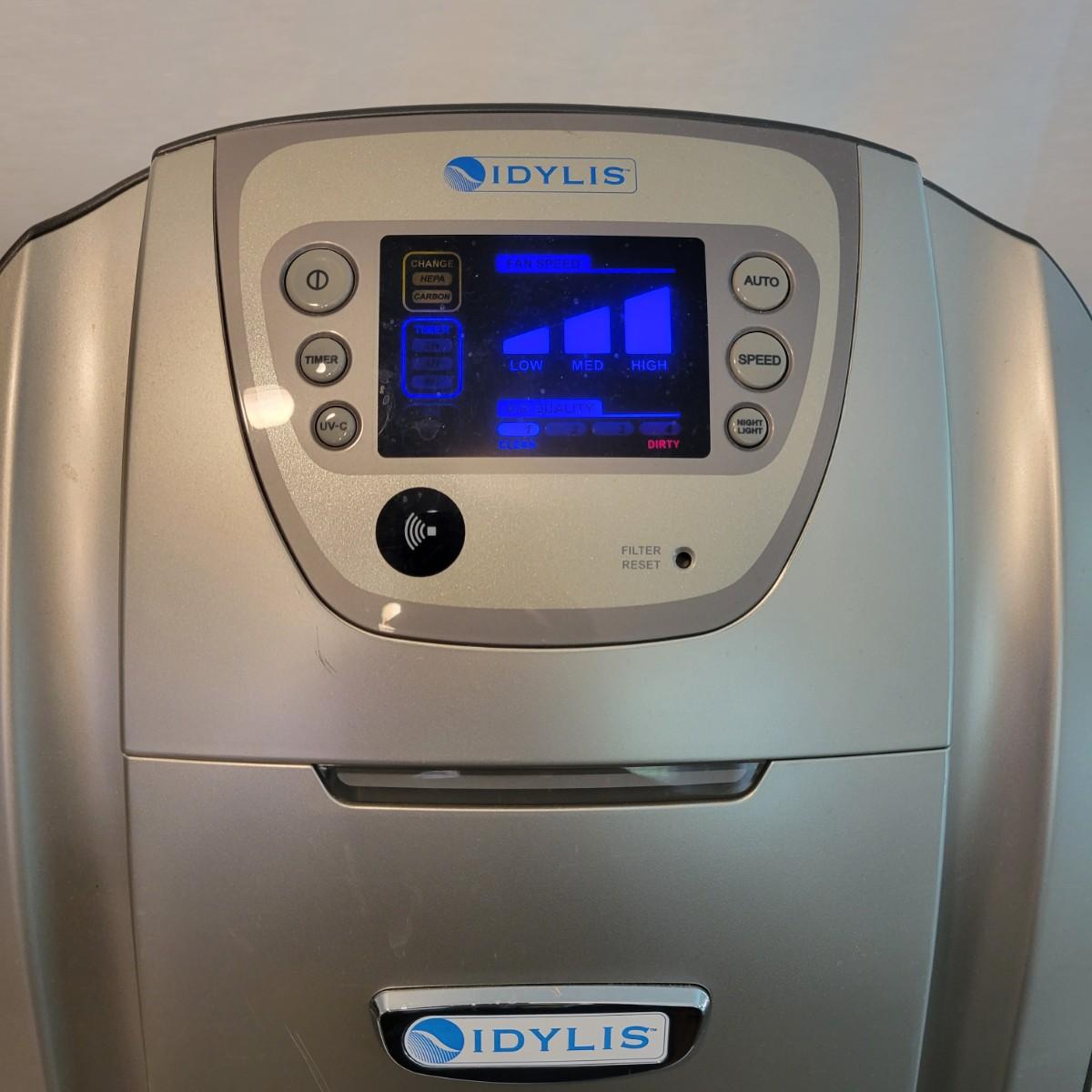 An Idylis air purifier that powered on when plugged in it features a HEPA air filter, carbon pre filter and a UV-C lamp. Included is a remote control and a carbon pre filter and it measures approximately 11.5" x 10" x 34"H. Local pickup only