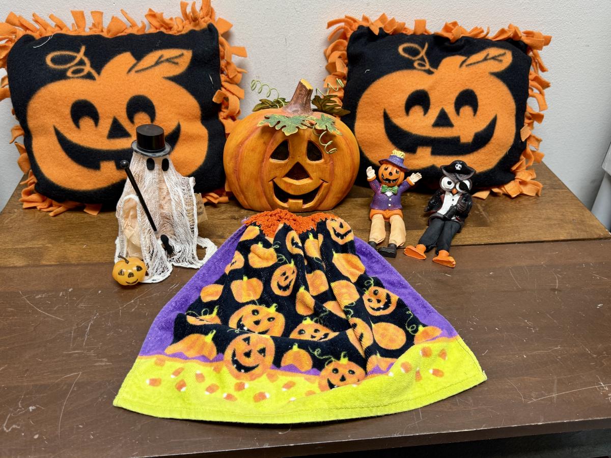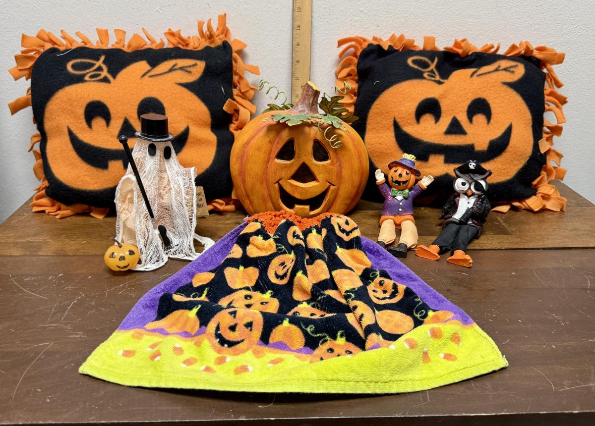 Smiling Jack-O-Lantern pillows with orange fringe, ghost, pumpkin-head scarecrow and pirate owl figurines, hand towel, and more.