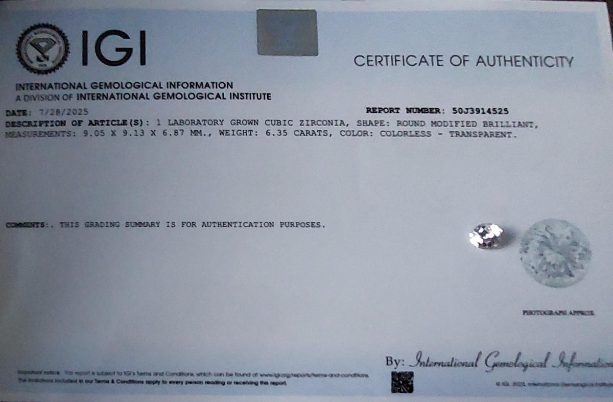 IGI CERTIFIED LAB GROWN CUBIC ZIRCONIA 6.35 cts
