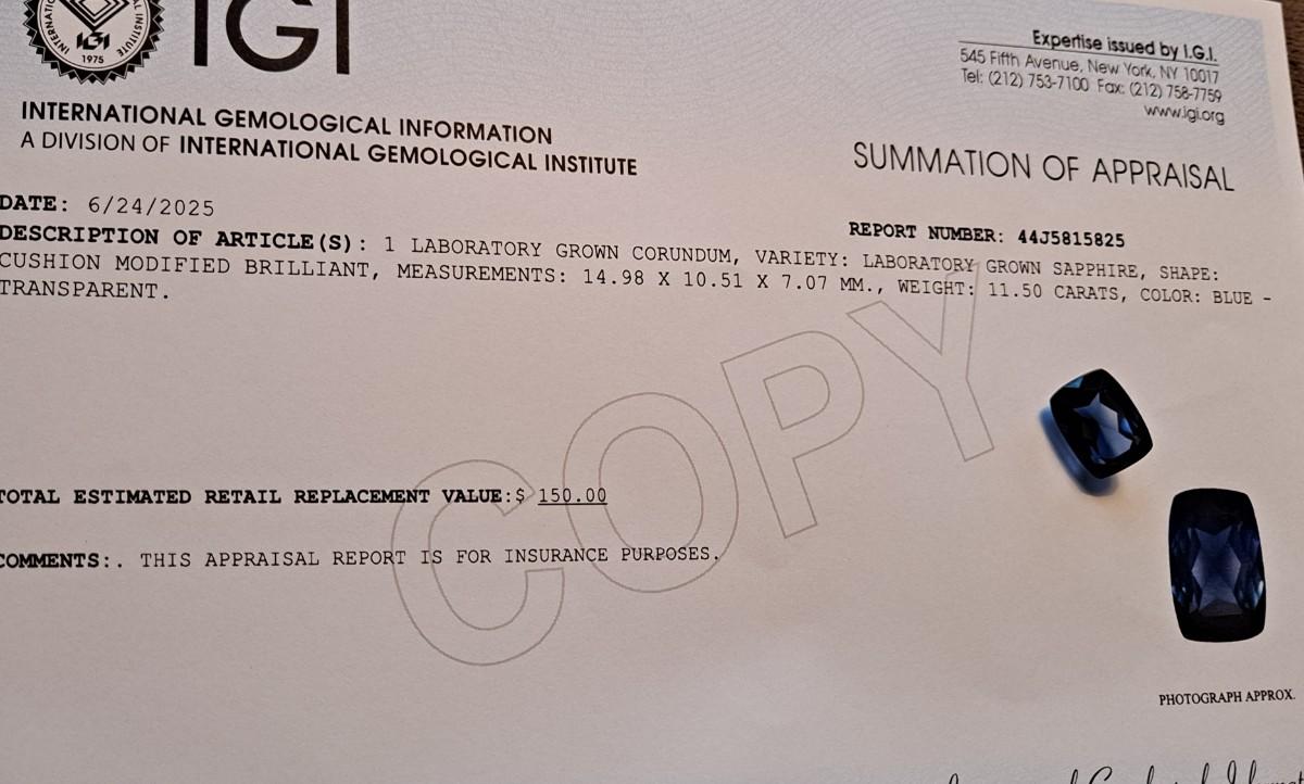 IGI CERTIFIED LAB GROWN SAPPHIRE 11.5 cts