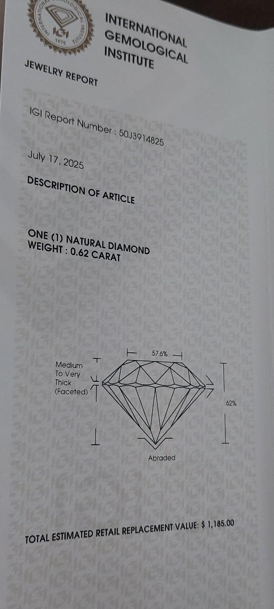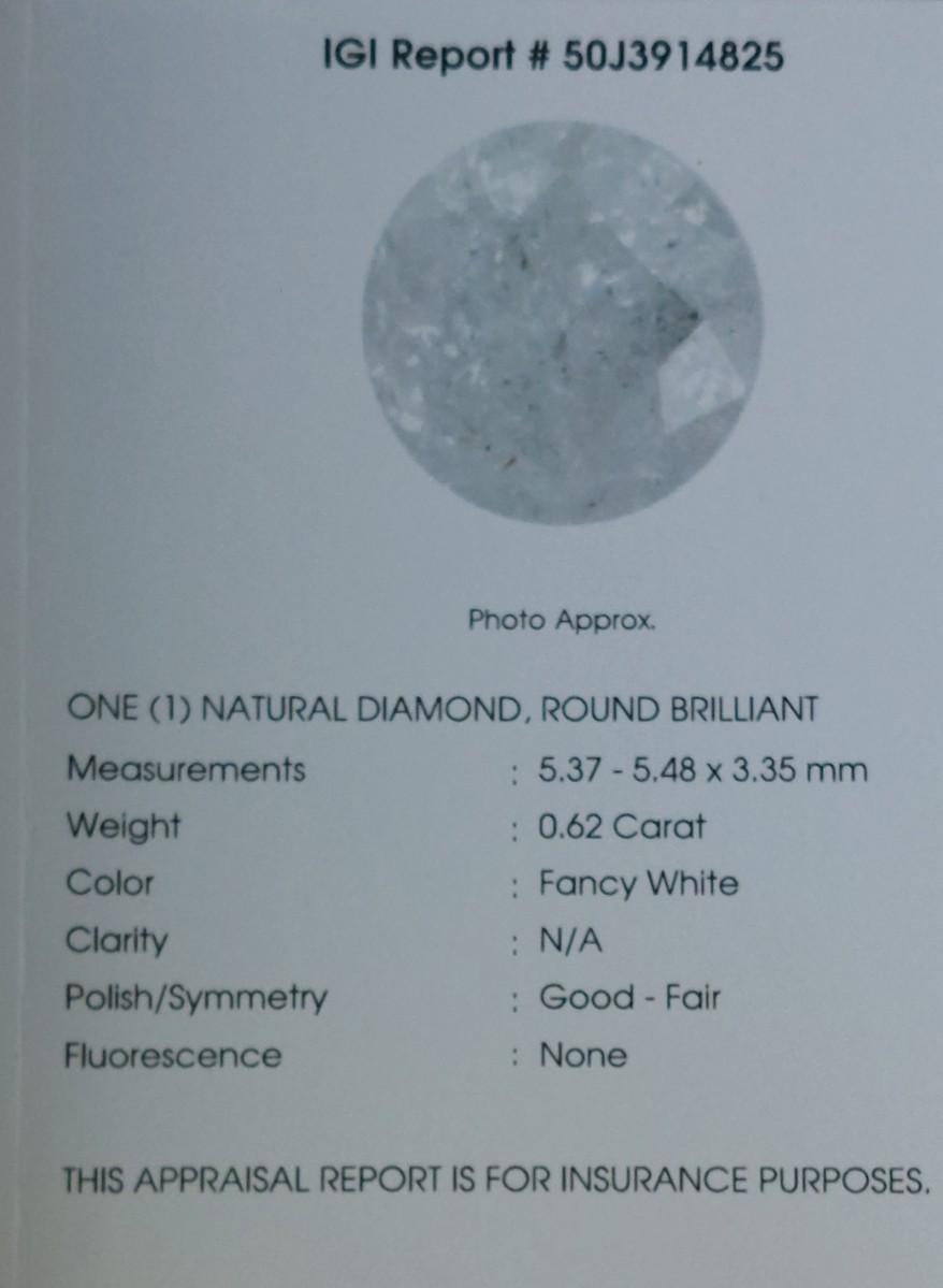 IGI CERTIFIED NATURAL DIAMOND. 62 cts
