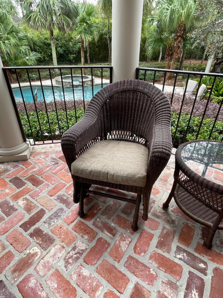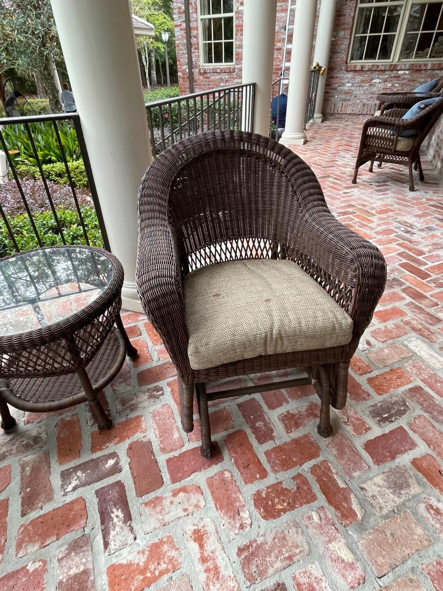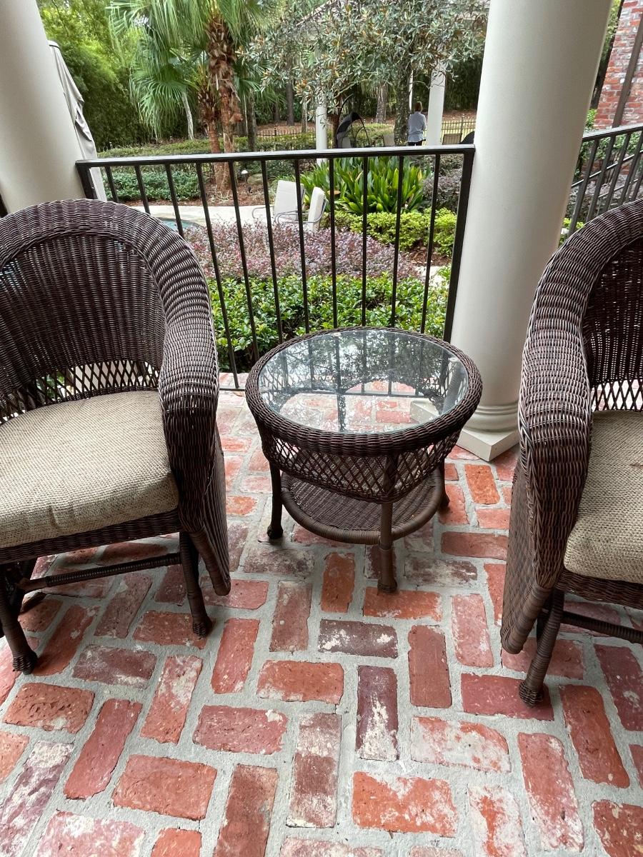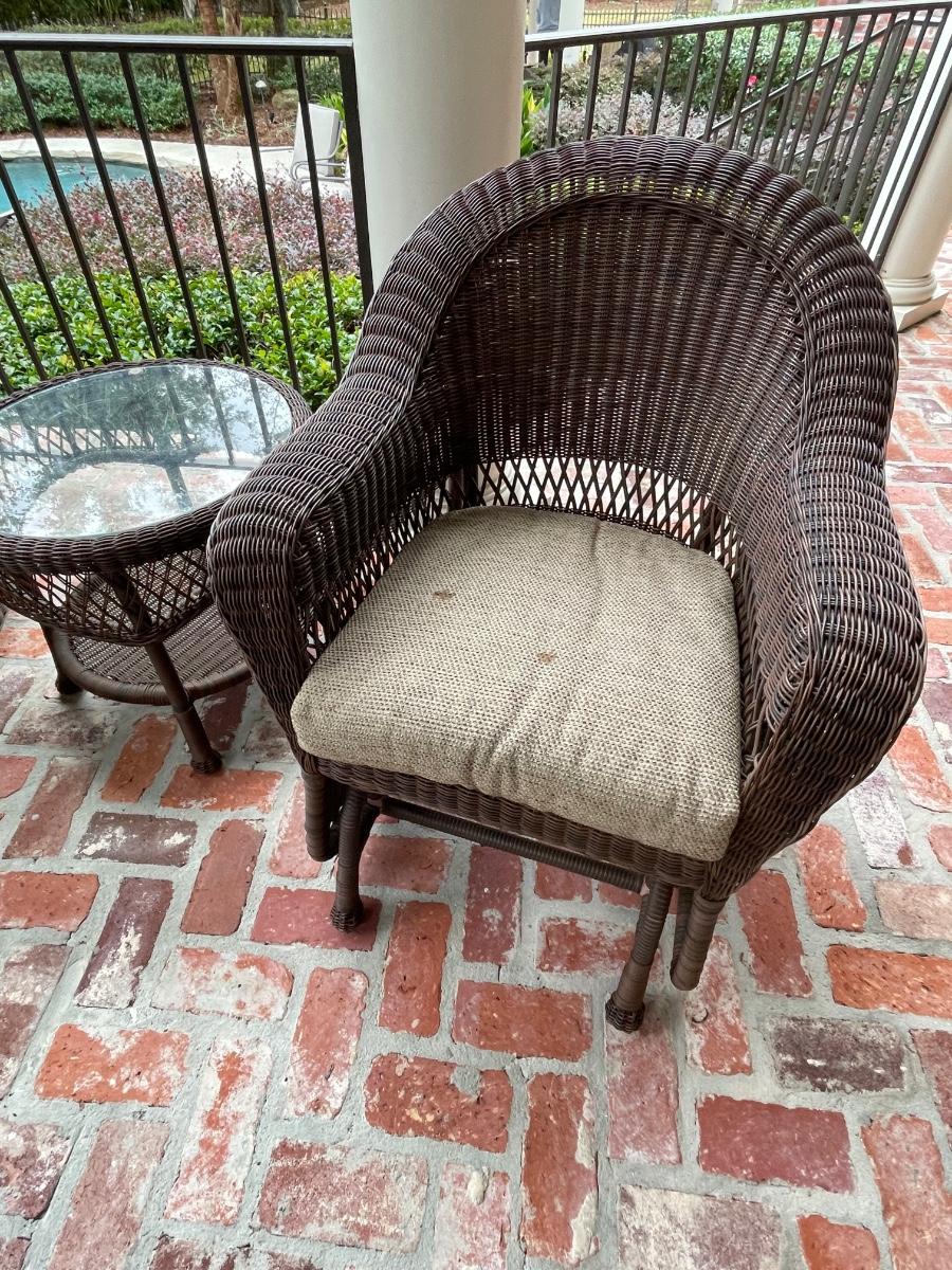Chairs are gliders = 36” H x 29” W x 28” D & table = 21” H x 23” Round ~ Porch kept ~ Glass top has minor surface scratches from use. Cushions need additional cleaning.