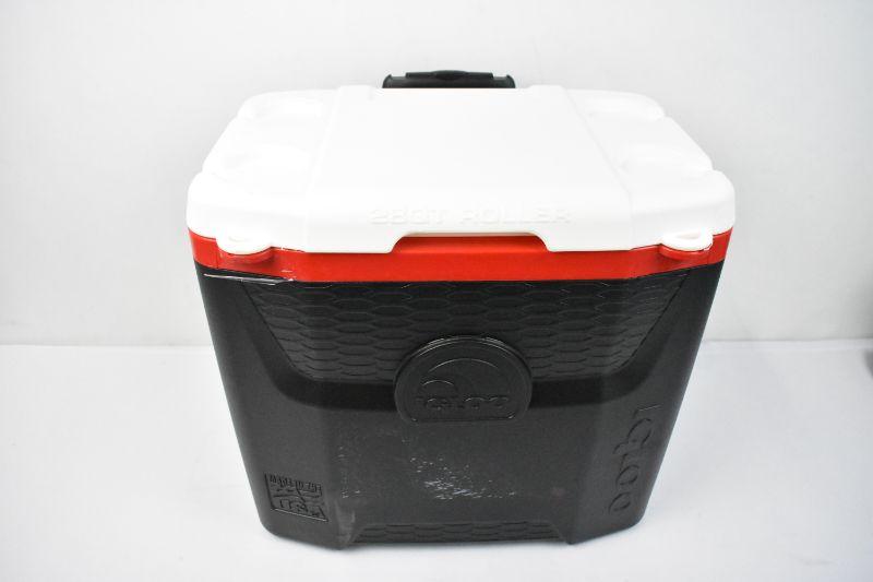 Igloo Cooler, Black/Red/White, 28 Quart Size, MISSING WHEELS