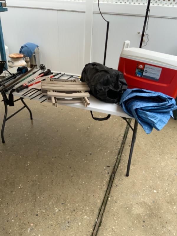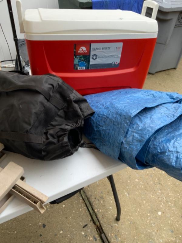 Igloo cooler, sleeping bag, tarp and other miscellaneous items for lot 2777