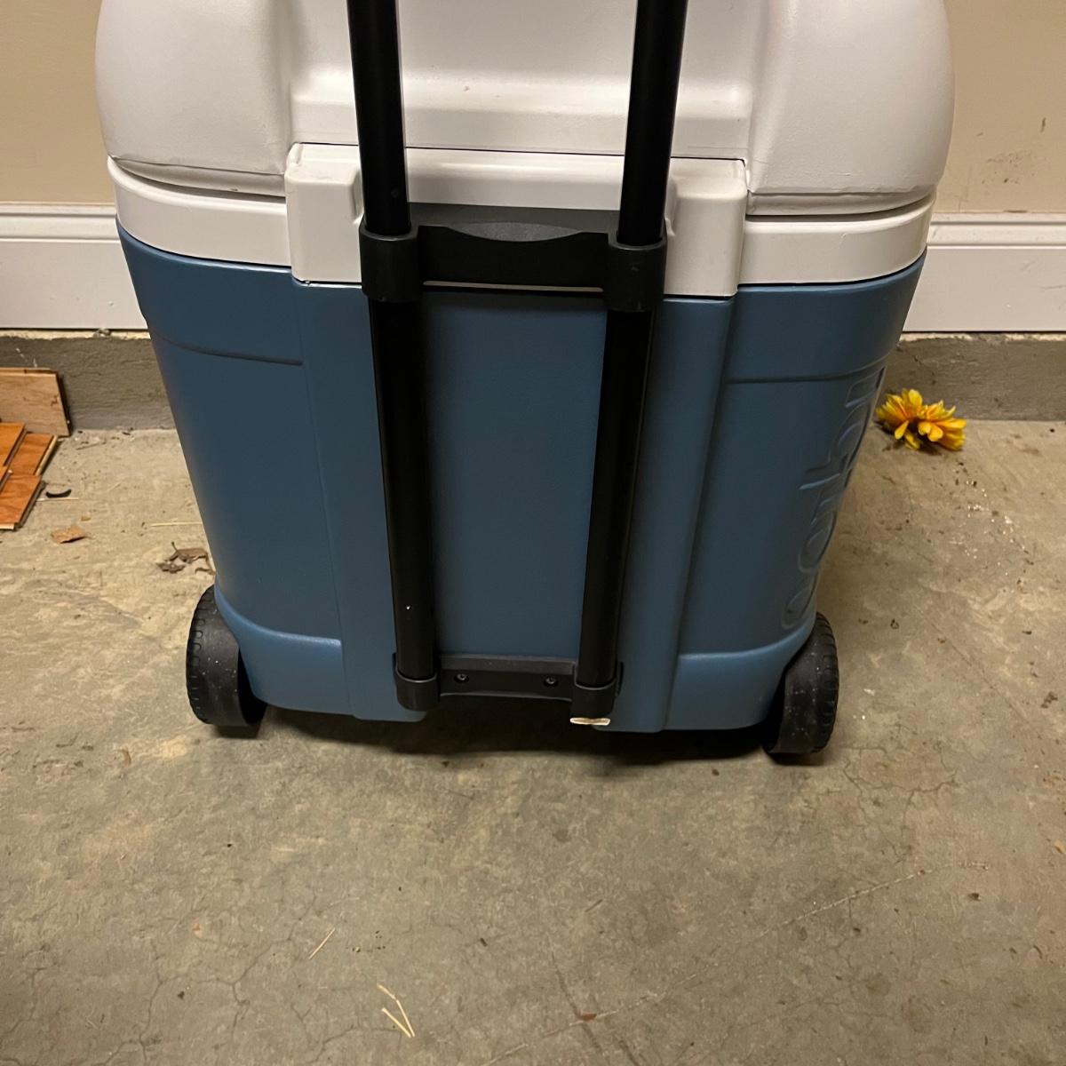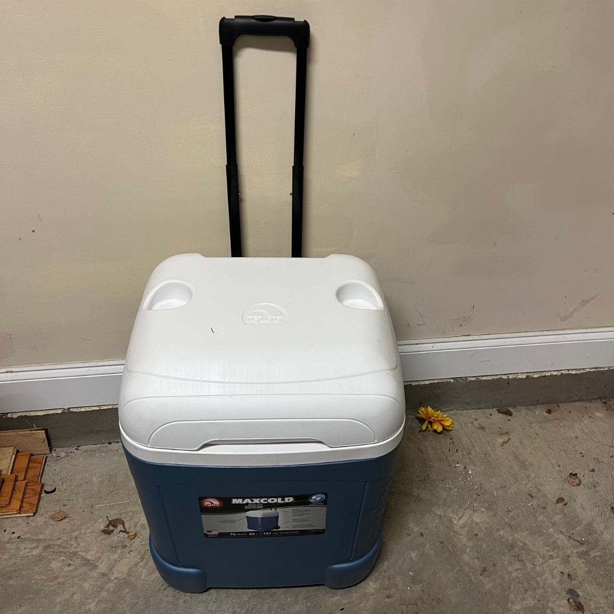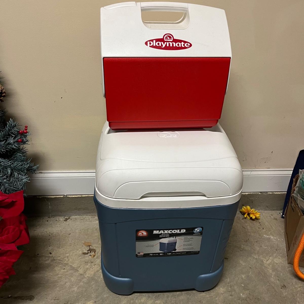 Lot includes à rolling Igloo cooler that measures 20” x 18” x 24”H with handle stored. Also includes a flip lid Igloo cooler.
