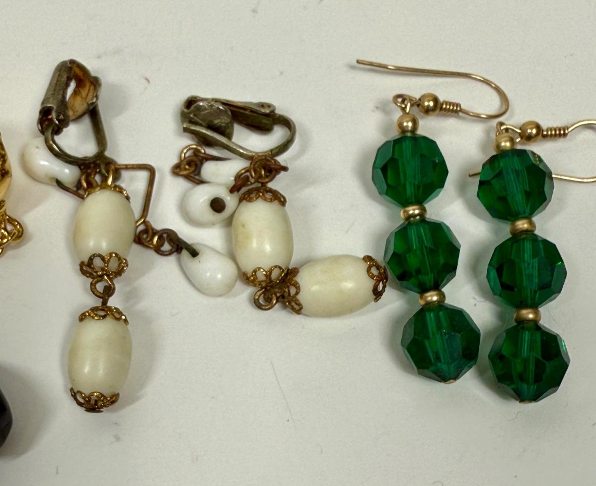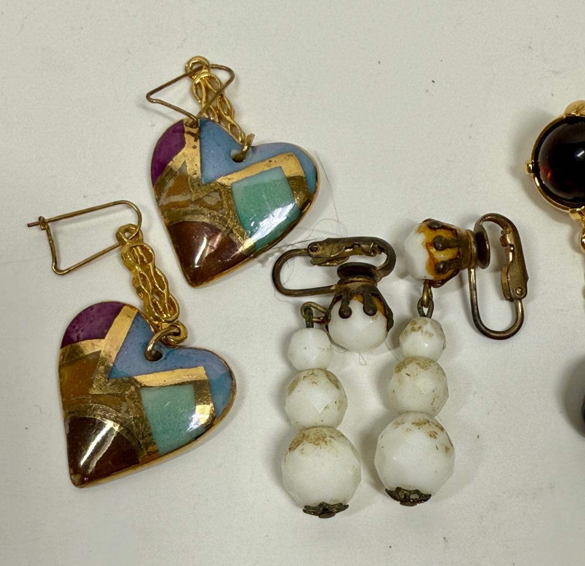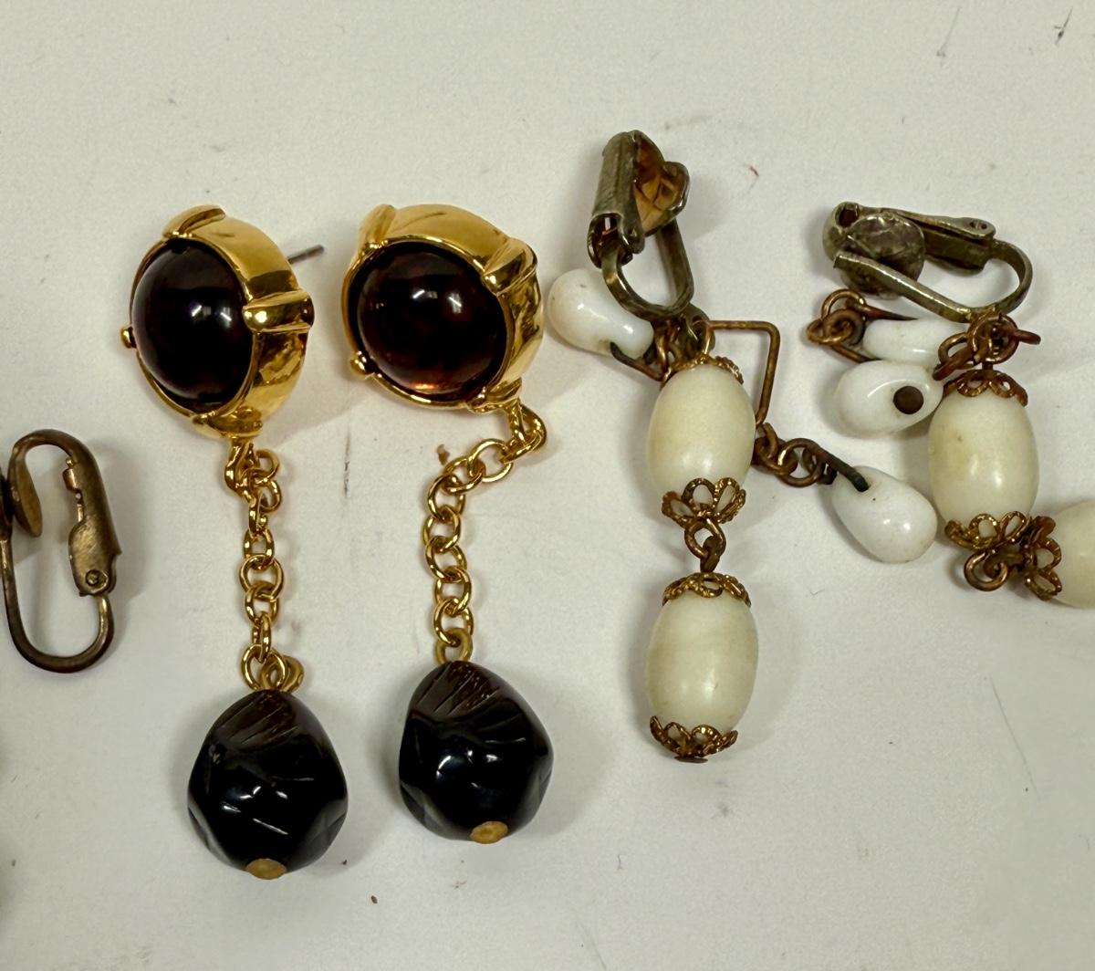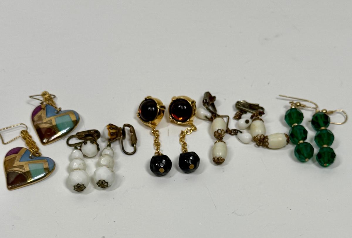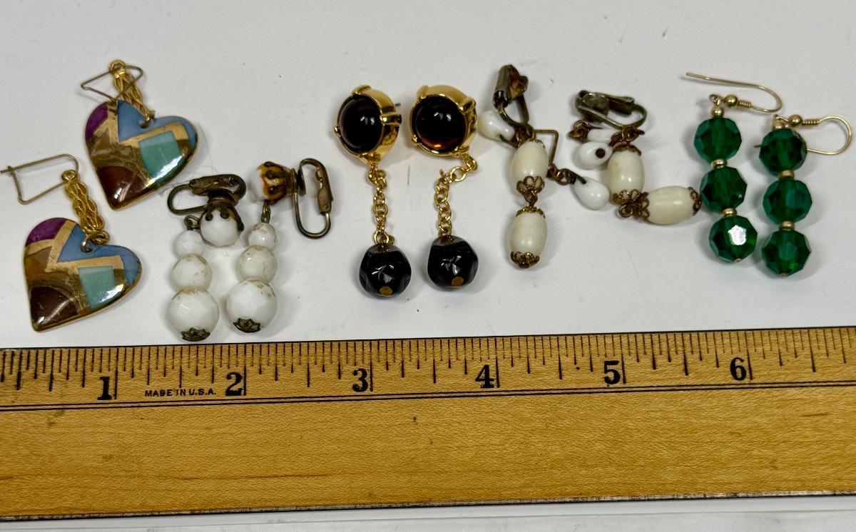 Lot includes 3 pair of dangling pierced ear earrings and 2 pair of clip-on dangling earrings. All in good condition.