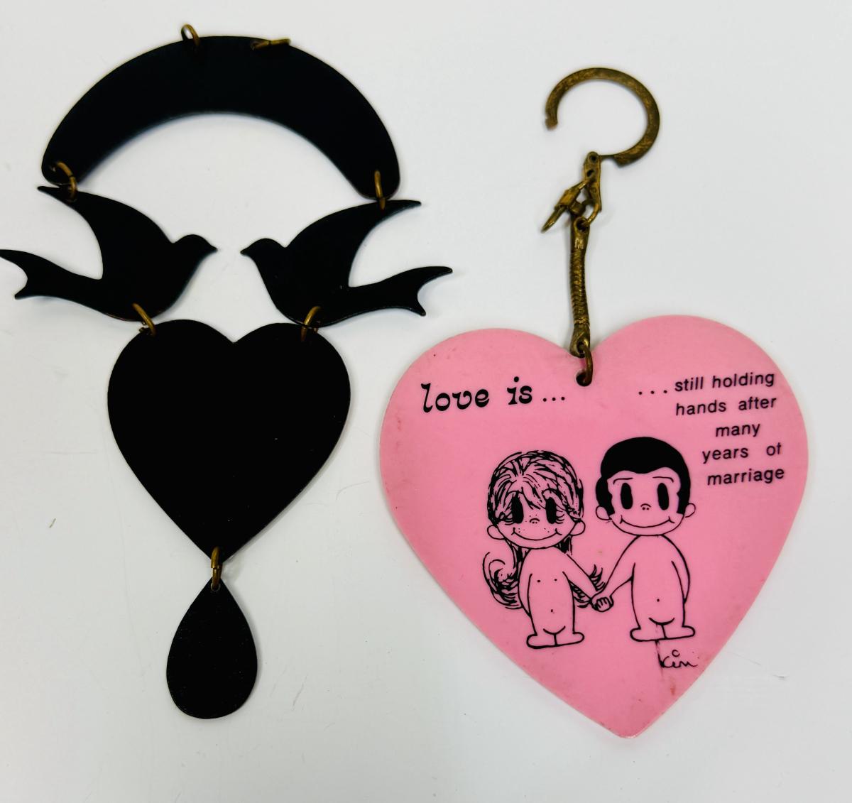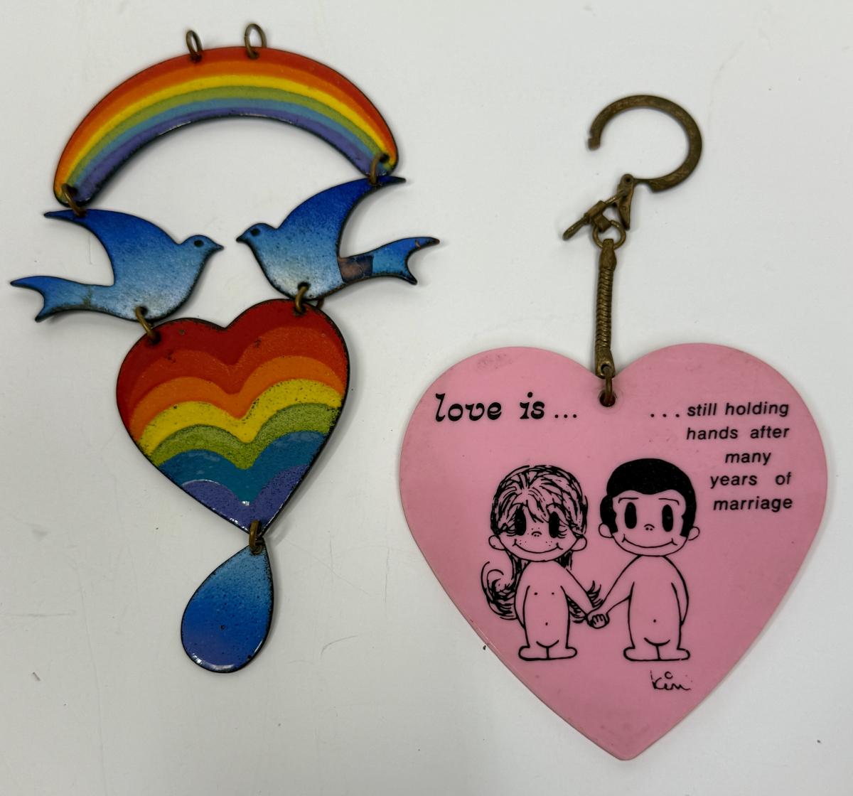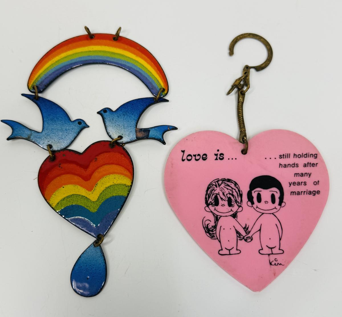 2 Retro 1970's Dangler & Keychain Rainbow Hearts & "Love is" art