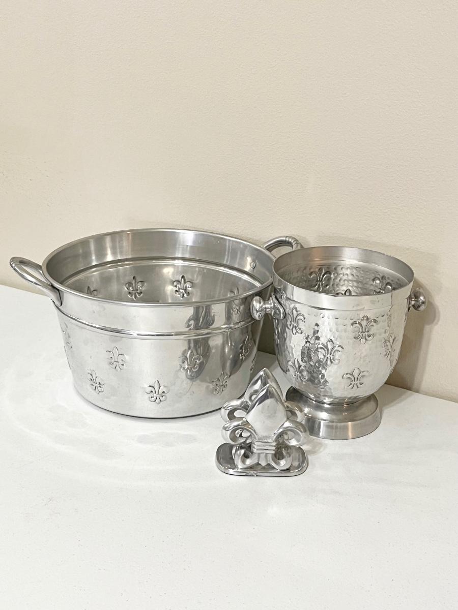 Tub = 8” H x 14” Round ~ Hammered Ice Bucket = 9.5” H x 8” Round ~ Napkin Holder = 5”H x 5” W