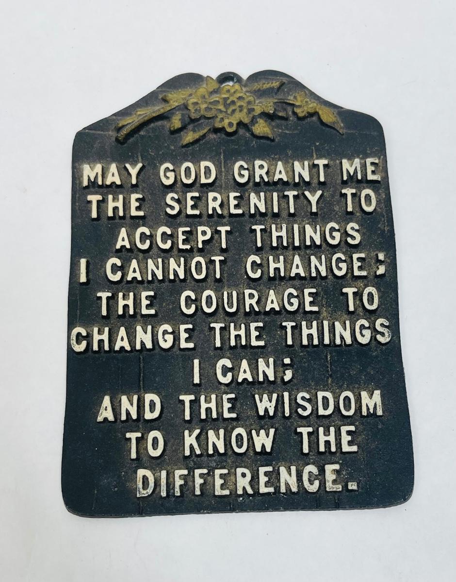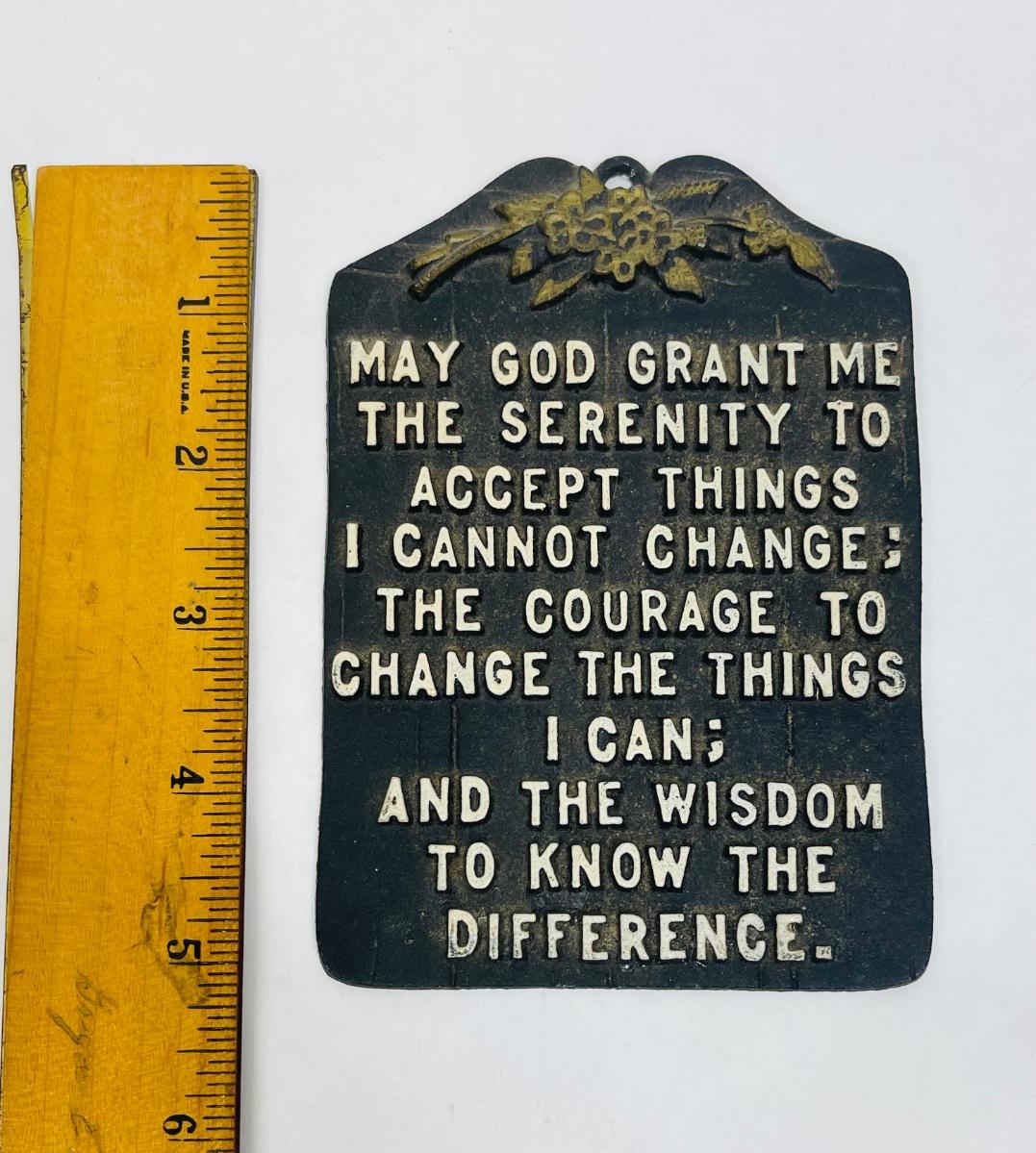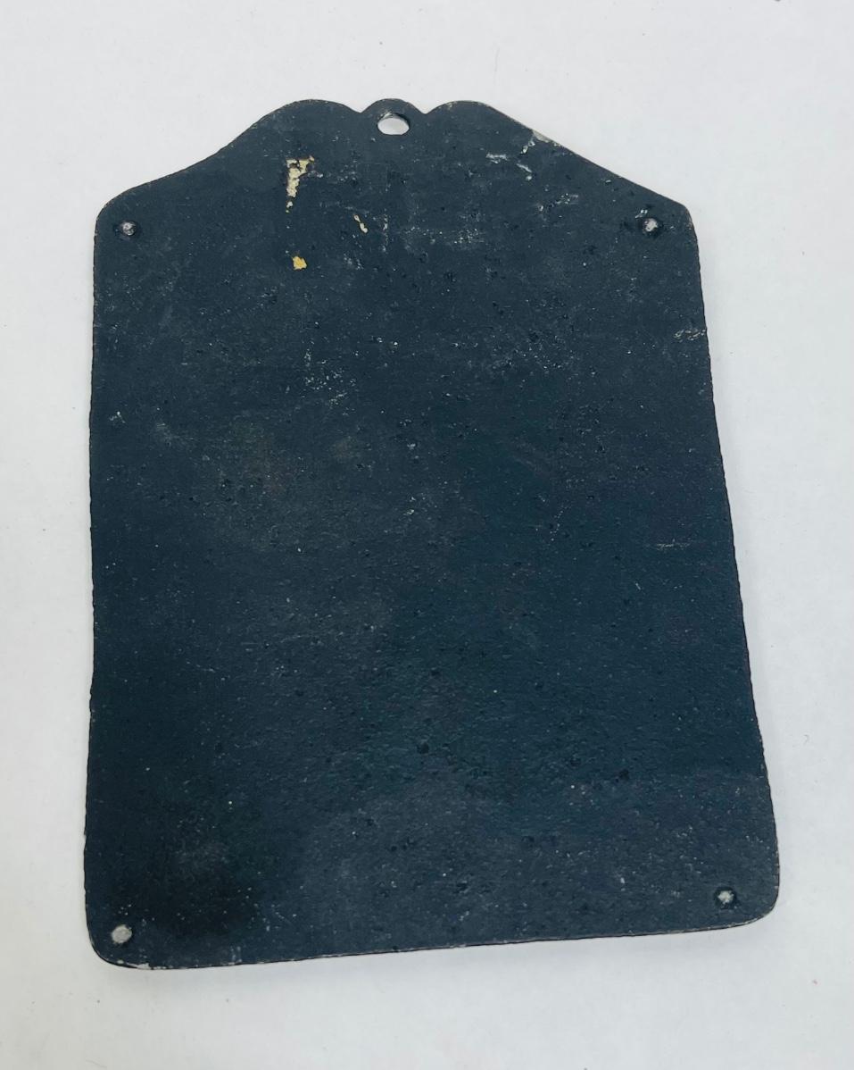 Sign is approx. 5" tall. Seems to be cast iron. Painted black with white lettering and green foliage symbol at the top. Good, undamaged condition.