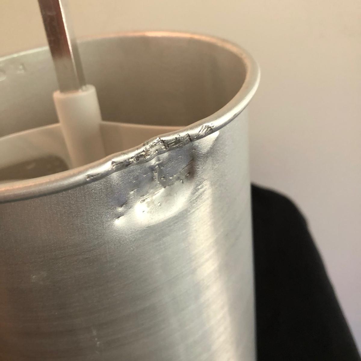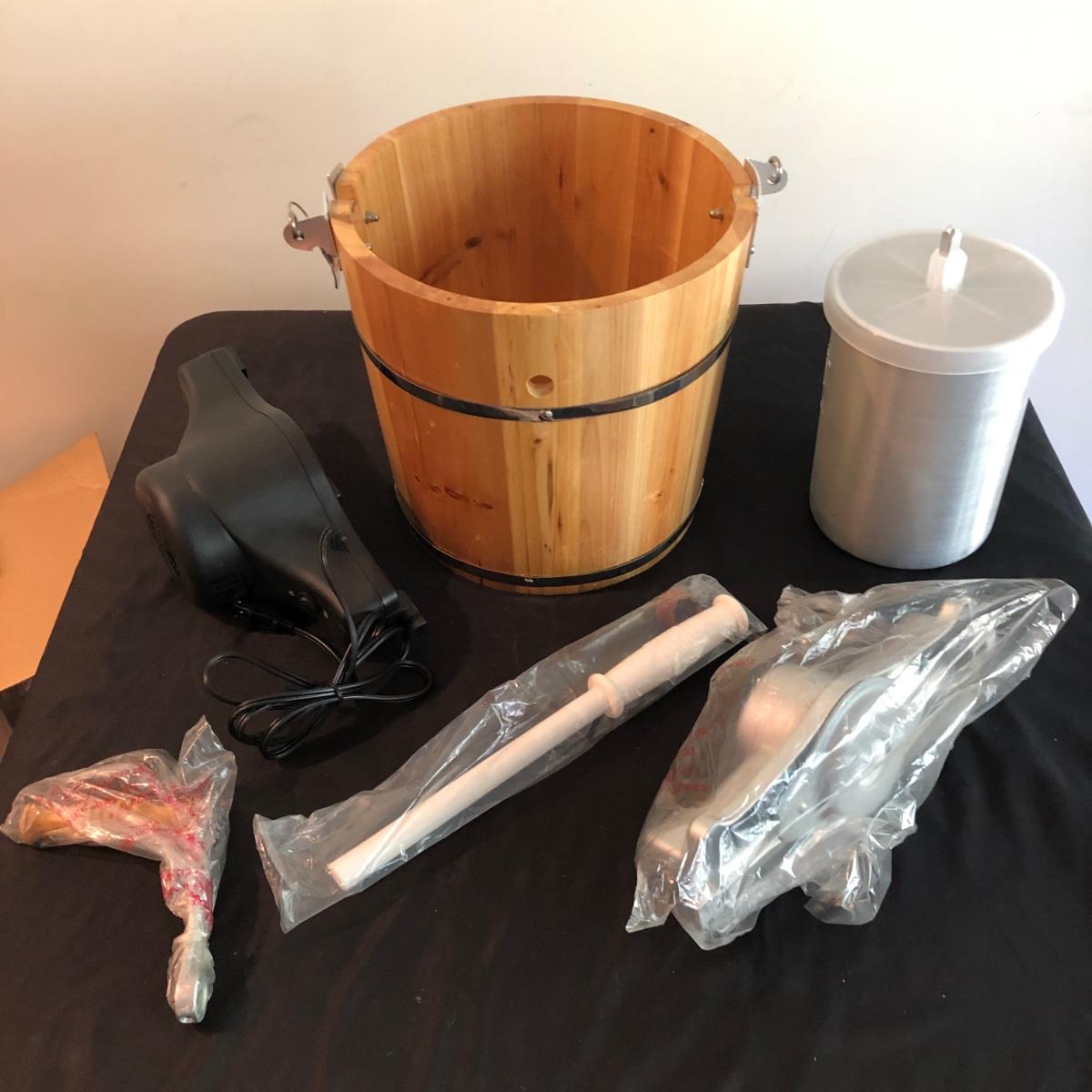 This Aroma 4 quart ice cream maker is in its original box. Some of the parts appear to be in their original packaging. The metal cylinder does have a dent as pictured. The top piece did power on and start spinning when plugged in. Instructions are not included. Local Pickup Only.